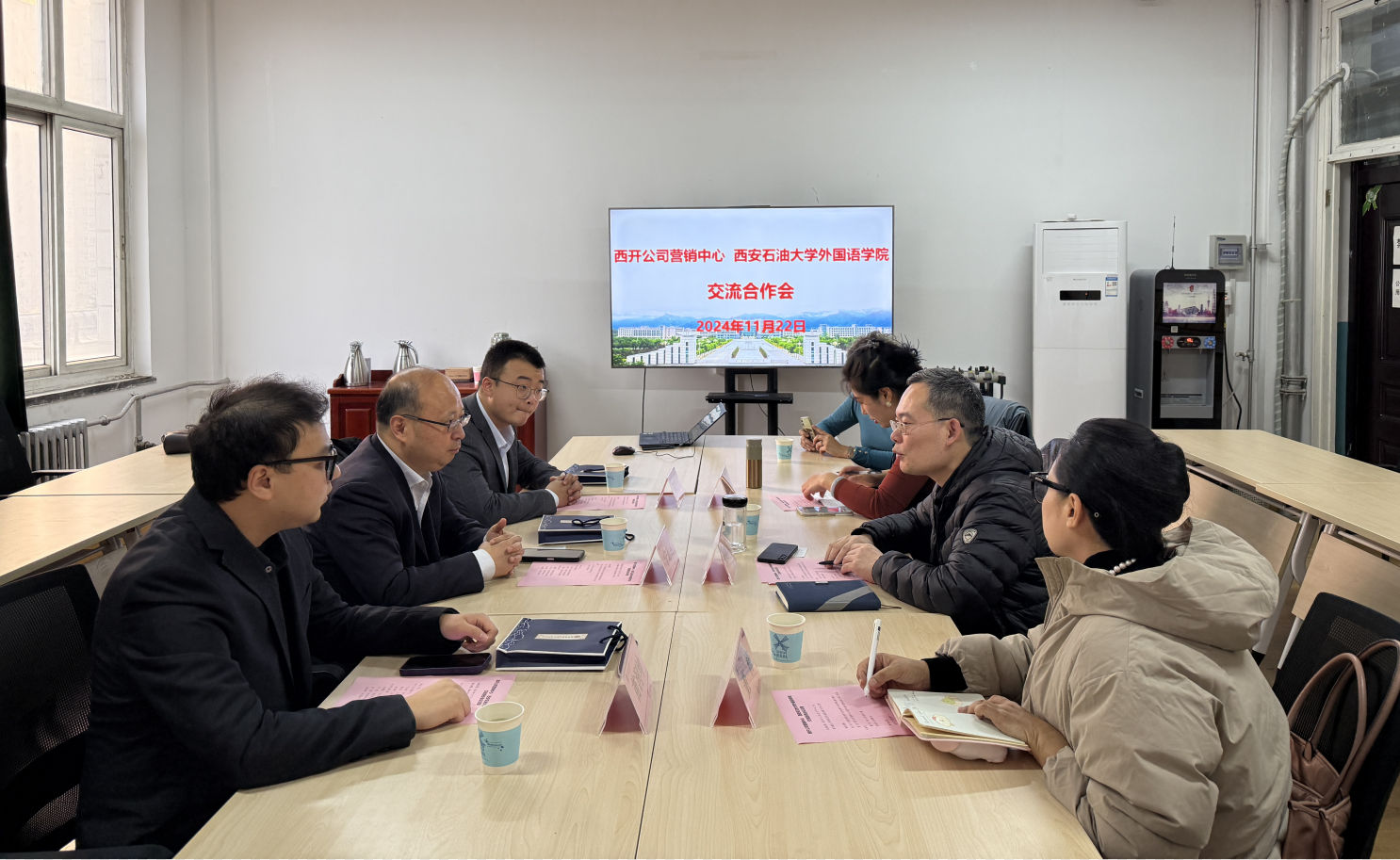 11月22日下午,外國語學院與西安西電高壓開關公司合作交流會在雁塔校區華油能源樓727會議室舉行。西安西電高壓開關公司營銷中心國際市場部營銷總監寧治遠、部門經理陳浩天、苗潤坤,外國語學院黨委書記張建高、教師代表董梅教授及意大利語老師張雨青參加了座談會。座談會由張建高書記主持。