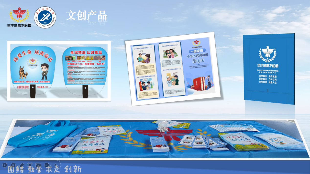 實踐活動開始前,為了擴大禁毒宣傳效果,團隊成員創作了6幅禁毒宣傳海報,設計了印有禁毒知識的扇子,漫畫三折頁以及環保手提袋等文創產品。