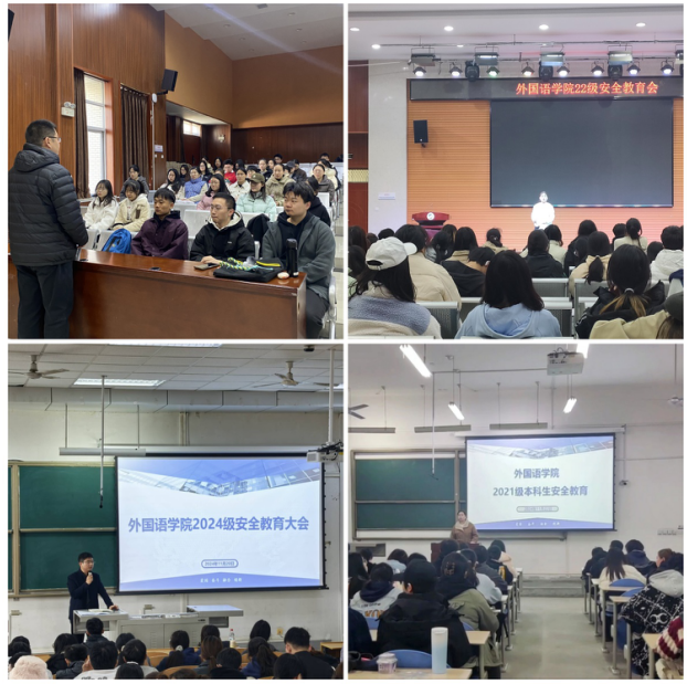 為進一步強化學生安全意識、防詐騙意識、自我保護意識,根據學校統一安排部署,外國語學院各年級于11月20日至28日分別在鄠邑校區博覽樓A239、崇文樓118召開安全教育大會,會議由各年級輔導員主持。