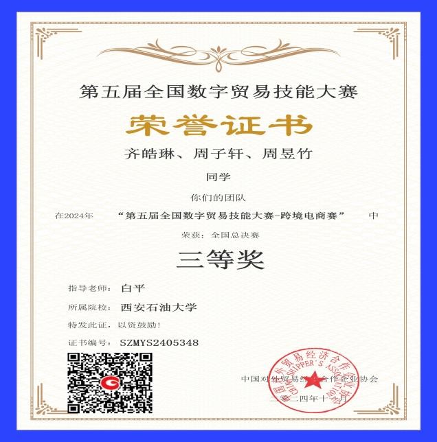 2024年11月20日-11月24日,由中國對外貿易經濟合作企業協會主辦,南京步驚云軟件有限公司承辦的“第五屆全國數字貿易技能大賽跨境電商賽項”成功舉辦。來自全國217所本科、高職、中職院校的3592支隊伍共計10776人參加了比賽,其中中職組232支隊伍,選手696人;高職組1251支隊伍,選手3753人;本科組2109支隊伍,選手6327人。經過五天的激烈角逐,由白平老師指導的1支參賽隊伍在本次比賽中榮獲全國三等獎。