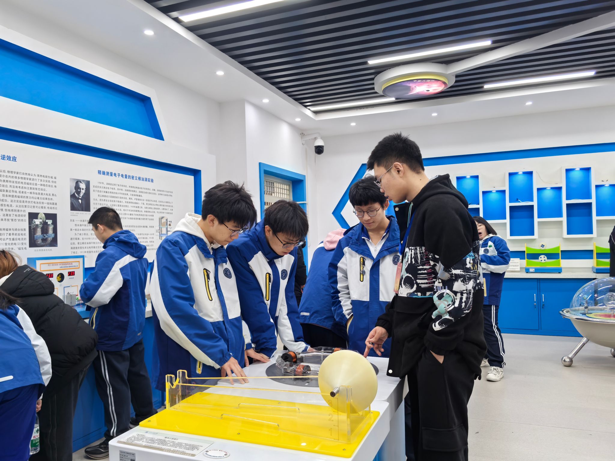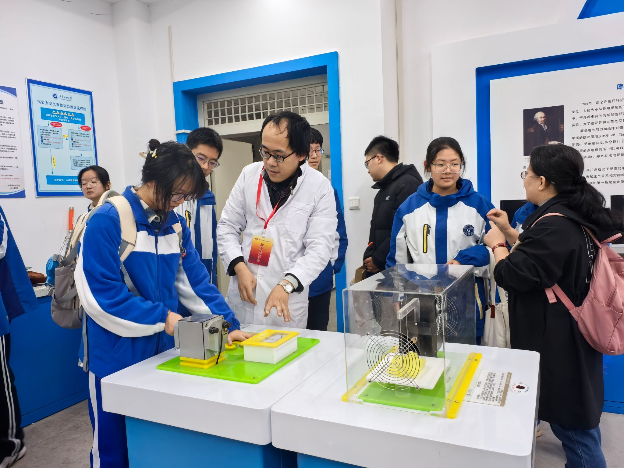 研學活動第二站來到理學院物理演示實驗室。物理演示實驗室是陜西省科普教育基地,是集圖像演示、實物操作等功能為一體的開放性實驗室,涵蓋了力學、電磁學、光學、熱學等方面知識。理學院師生志愿者分組帶領五高師生進入實驗室,逐一演示了引人入勝的雅各布天梯,生動展現了電流的神秘躍動等,讓參觀者直觀感受到能量轉換的奇妙過程;震撼人心的電磁炮發射,以直觀、震撼的方式詮釋了電磁力的強大威力。這些精心設計的演示活動,不僅激發了學生對物理學奧秘的好奇心與探索欲,更為大家搭建起了一座通往科學殿堂的橋梁,讓物理之美躍然眼前,深入人心。