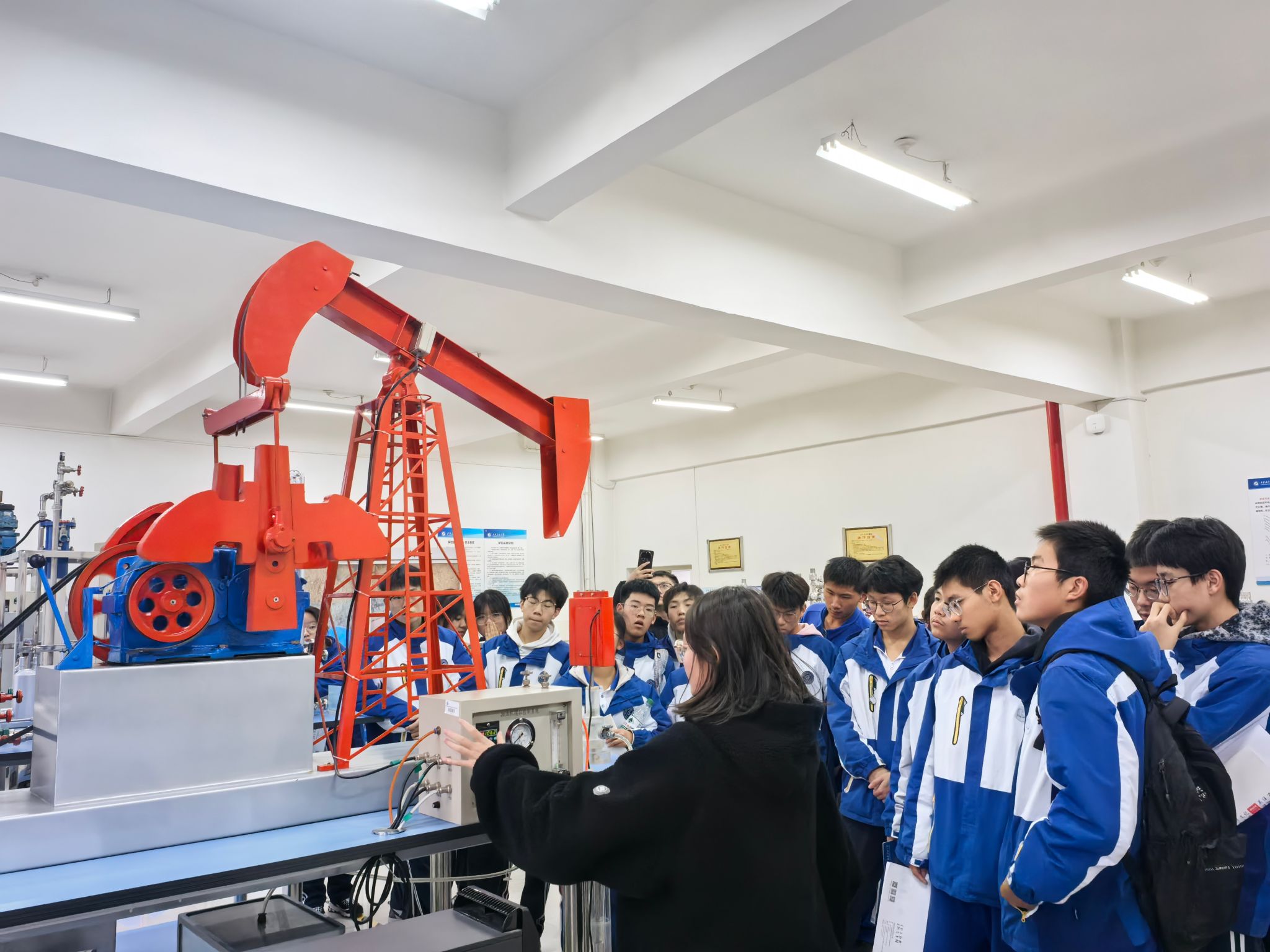 研學活動最后一站參觀了我校陜西省石油石化虛擬仿真實驗教學中心。在講解員的帶領下,五高師生參觀了鉆井實訓室、地質標本實訓室、采油實訓室、油氣分布沙盤、集輸、煉化實訓室、采油實訓室,使學生初步了解了石油勘探、開采和運輸的全過程,近距離感受到了石油石化及地質行業的魅力與挑戰。