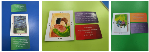 本次活動主題為“卡牌心橋—與自己對話”,意在通過歐卡牌讓同學們更深入、更直觀地感受到自身心理映射和情緒體驗,并通過交流分享,助力大家避免壓抑、開放身心?;顒娱_始,同學們隨機分為三個小組,李夏凝讓每位同學以動物自比,幫助大家初步了解個人性格和特質。隨后,進行歐卡牌團訓,同學們分四次分別抽取彩虹卡、圖卡、字卡、彩虹卡,并圍繞卡牌內容、選擇理由、自身感受等進行分享。最后,李夏凝邀請有分享意愿的同學進行發言,講述自身體會,并以此為衍伸,鼓勵同學們在生活中要敢說、想說、多說,及時表達自我,避免因憋悶、鉆牛角尖等形成不好的情緒體驗。整個活動氛圍親切、溫馨,同學們紛紛表示體驗感極佳,也通過本次活動在一些問題上有了新的認識,更清楚了內心深處的想法。