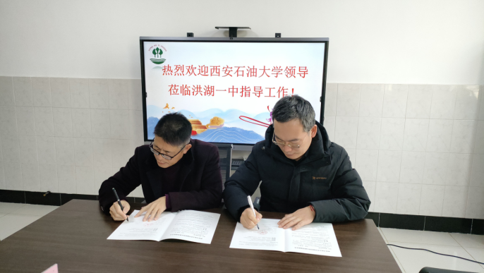 在洪湖市,學校一行與洪湖市第一中學副校長戴裕明等領導進行座談。雙方介紹了各自的辦學歷史、辦學規模、辦學特色,并就繼續開展更為深入的合作進行深入交流。張建高代表學校與洪湖市第一中學領導共同簽署《西安石油大學優秀生源基地建設協議》,授予“優秀生源基地”牌匾并贈送了錄取喜報。