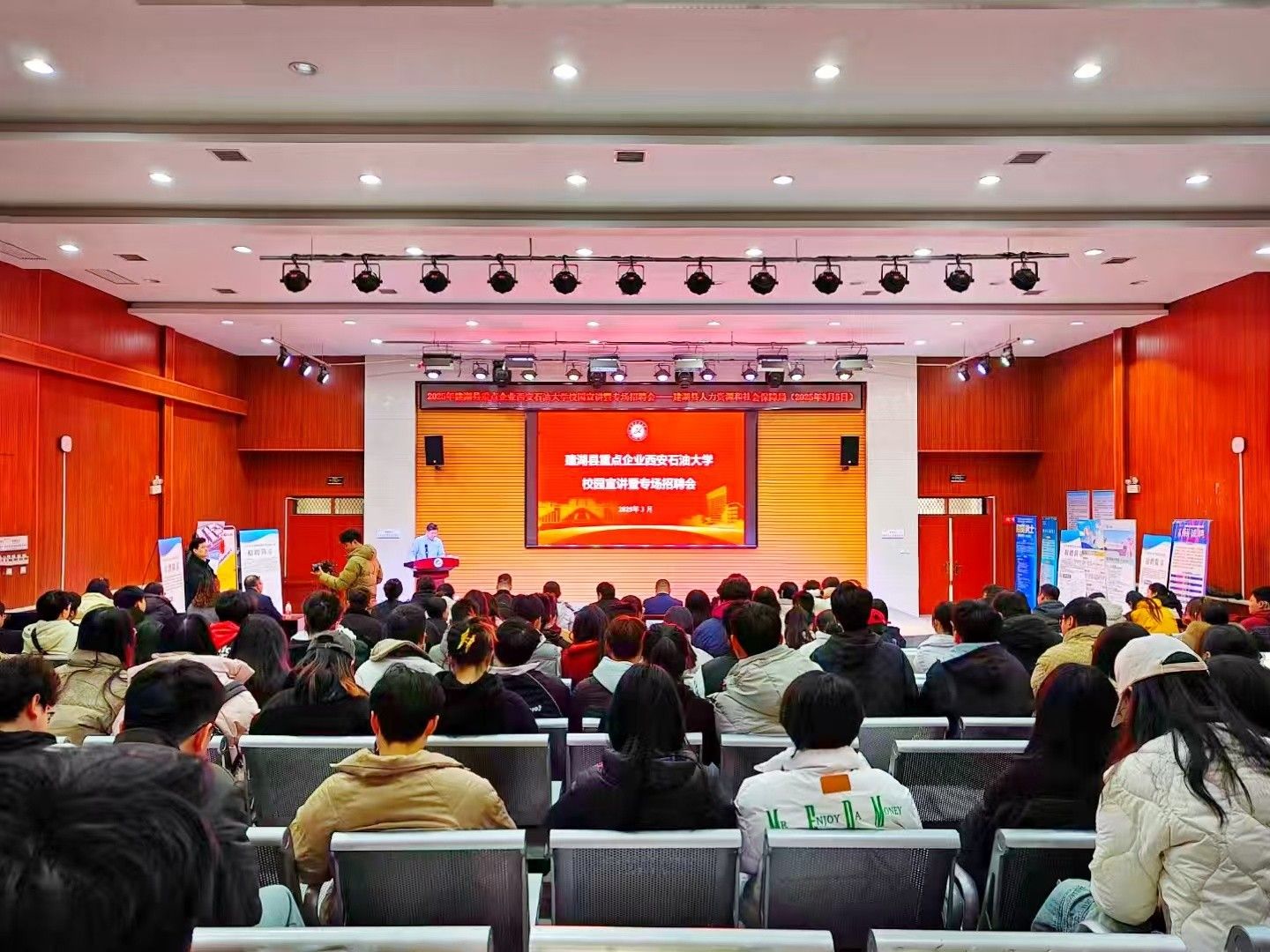 3月5日上午,建湖縣重點企業西安石油大學校園宣講暨專場招聘會在我校鄠邑校區崇文樓118報告廳舉辦。來校招聘期間,副校長趙健會見了建湖縣人力資源和社會保障局副局長韓建軍一行,雙方就深化校地、校企產學研合作進行了交流會談。我校就業創業指導中心主任王亮出席招聘啟動儀式并致辭,就業創業指導中心全體工作人員,2025屆畢業班輔導員,畢業生代表300余人參加會議。