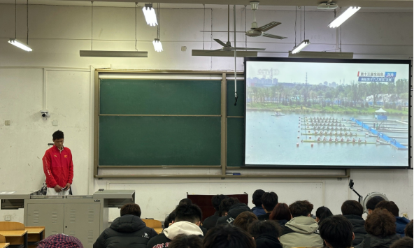 報告會上,茍毅飛首先介紹了舉辦本次報告會的目的,一是讓廣大學生了解賽艇運動知識,熟悉賽艇運動文化,并由此愛上賽艇運動;二是通過選拔的方式,組建學校賽艇運動隊,并通過專業訓練,能在各類賽艇比賽中獲得佳績,為學校爭得榮譽。