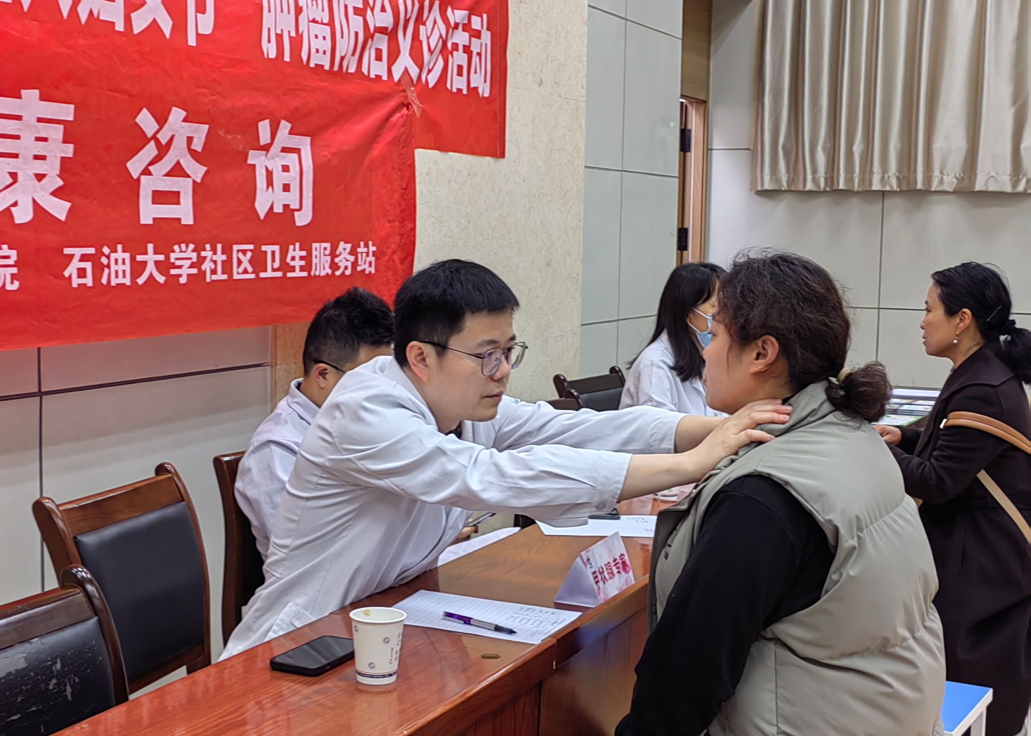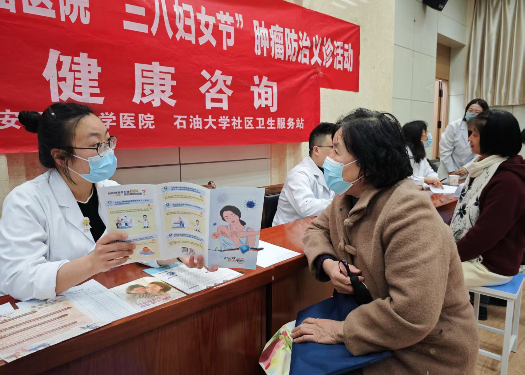 講座結束后,乳腺、婦瘤、頭頸外科等科室組成的知名專家團隊現場提供一對一健康咨詢服務,專家們認真細致地為教職工和家屬提供常見腫瘤防治指導,并現場開展健康查體。同時,HPV疫苗咨詢區也備受關注,工作人員針對HPV疫苗適應人群,進行詳細而全面解答,幫助女教職工們做出更適合自己的健康選擇。