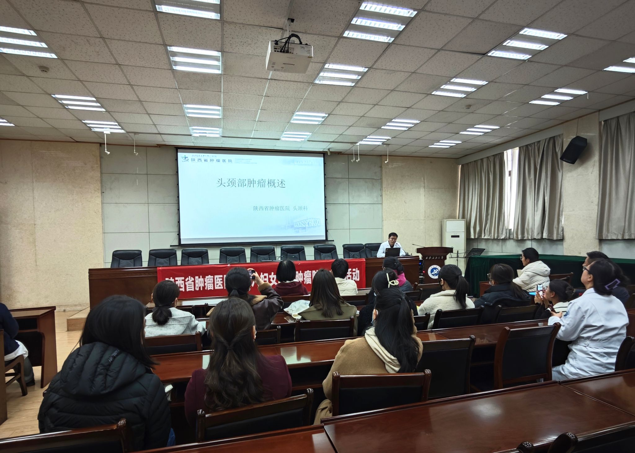 活動現場,陜西省腫瘤醫院乳腺三病區主任醫師陳楠和頭頸外科副主任醫師李繼峰受邀擔任主講。兩位專家憑借豐富的臨床經驗和專業知識,結合臨床典型案例,用通俗易懂的語言,深入剖析了乳腺癌、頭頸部高發腫瘤的早期癥狀及篩查手段,強調定期篩查是降低腫瘤死亡率的關鍵,幫助女性樹立科學的防癌意識。現場互動環節,大家積極提問,專家們耐心答疑,學習氛圍濃厚。