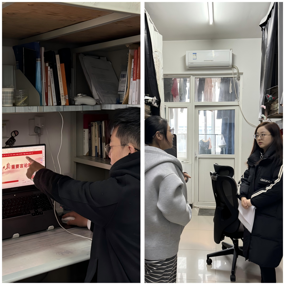 檢查中,研究生工作部負責人及各學院主管領導與研究生深入交流,詳細了解開學以來的學習科研、生活內務及思想動態,進一步強調,宿舍是研究生日常生活的重要場所,保持良好的宿舍環境不僅有助于身心健康,也能為學術研究提供有力支持。領導老師們叮囑同學們科學安排科研學習,統籌作息安排,增強安全意識,嚴守宿舍管理規定,杜絕違規用電,保障學習生活安全有序。