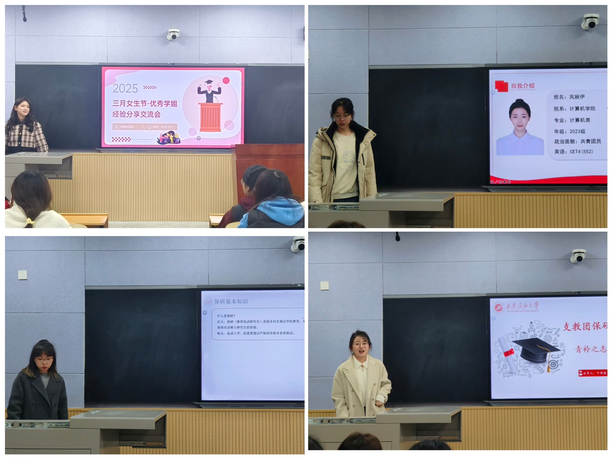 在優秀學姐經驗分享活動中,學院邀請了多位優秀的在校生代表,分享她們在學業、科研、實習以及生活中的經驗與心得。這些優秀榜樣從不同角度講述了她們如何平衡學習與生活、如何面對挑戰與壓力,以及如何在計算機領域中找到自己的方向。