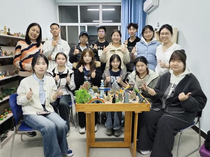 工作研討后,團隊成員齊聚崇文樓 447(沙盤創作室),在老師的帶領下,進行了團體沙盤活動。成員們積極參與創作和體驗,在活動中加深了理解,增進了溝通,團隊更加向心凝聚。