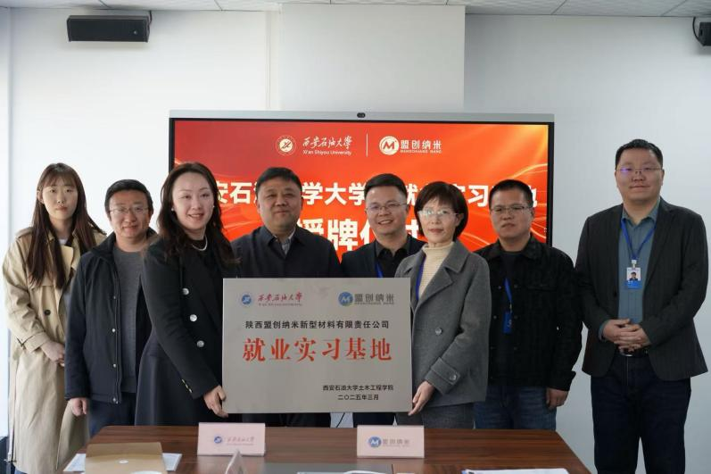 隨后賈莉娜代表西安石油大學土木工程學院向陜西盟創納米新型材料有限責任公司頒發就業實習基地牌匾,高亮與張君分別代表校企雙方簽署就業實習基地協議書。