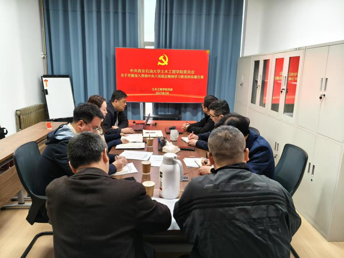 會上,賈莉娜領學了中央八項規定及其實施細則精神,傳達了學校關于開展深入貫徹中央八項規定精神學習教育的決策部署和相關要求,制定并解讀了《中共西安石油大學土木工程學院委員會關于深入貫徹中央八項規定精神學習教育的實施方案》。她強調,開展此次學習教育是鞏固深化主題教育和黨紀學習教育成果、縱深推進全面從嚴治黨的重要舉措,是密切黨群干群關系、鞏固黨的執政基礎的必然要求。