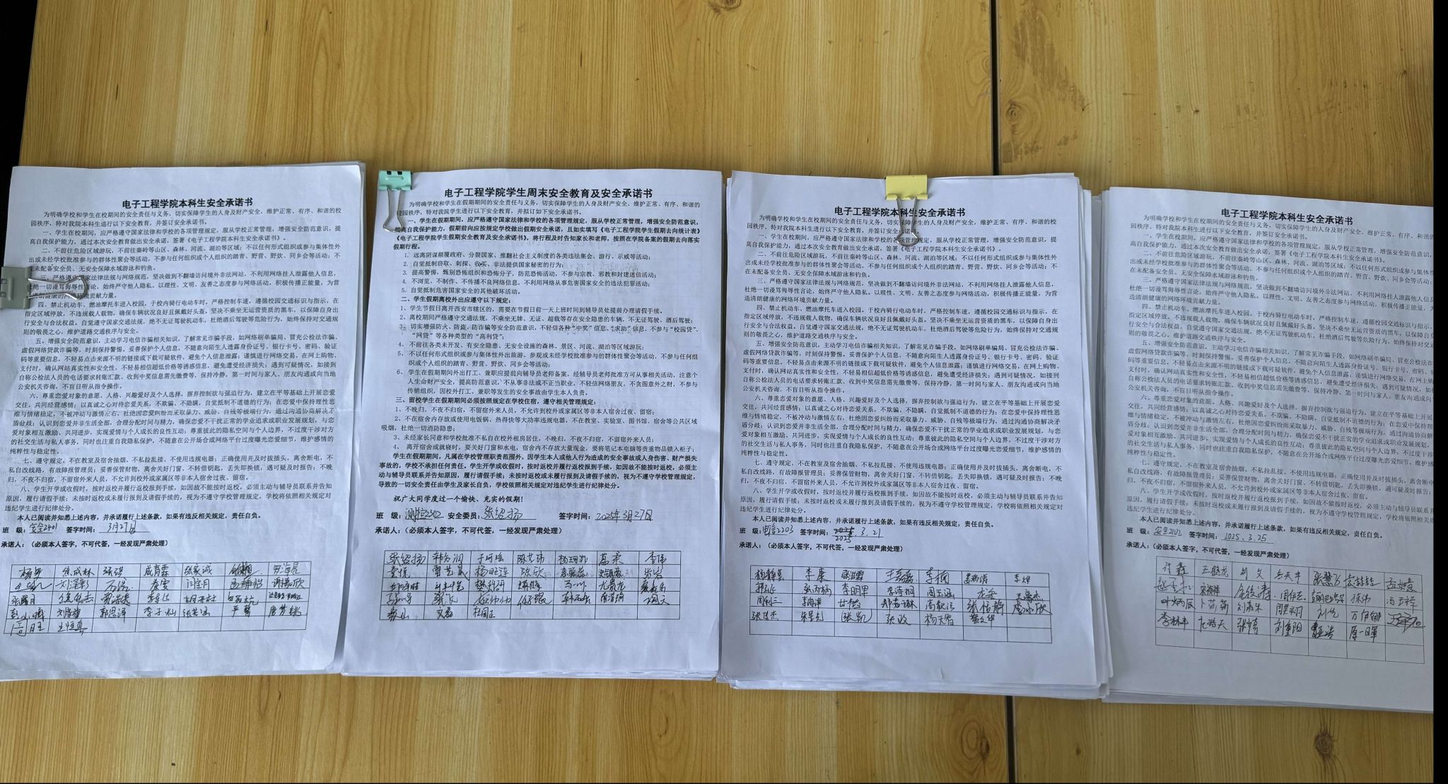 此次安全教育有利于進一步提高學生假期安全防范意識,強化學生行為規范與紀律意識,增強學生自我保護能力。學院將持續關注同學們思想動態,多途徑加強學生安全教育,注重提升學生多方面安全意識與素養,營造安全穩定的校園環境。會后,各年級輔導員老師組織學生閱讀并簽署了電子工程學院本科生安全承諾書。