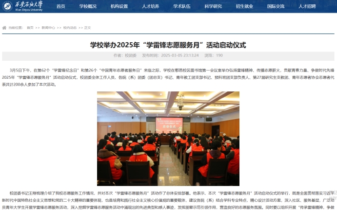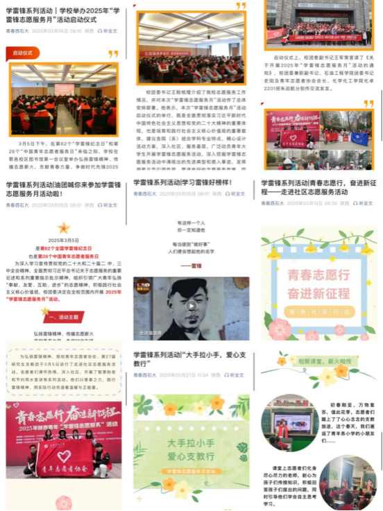 校團委結合我校實際,印發《關于開展2025年“學雷鋒志愿服務月”活動的通知》(西石大團發〔2025〕3號)。一是廣泛開展,扎實推進。統一組織學校各級團組織集中開展為期一個月的“學雷鋒”志愿服務活動,活動范圍覆蓋文明校園、社區服務、關愛留守兒童、鄉村振興、助殘助老、美麗中國等志愿服務活動,樹立新時代雷鋒精神榜樣,引領新時期志愿服務風尚;二是高度重視,科學謀劃。各院(系)團委高度重視,精心組織,統籌協調,團委書記、團支部書記認真學習習近平總書記對深入開展學雷鋒活動的重要指示批示精神,結合各院(系)實際情況,精心設計活動方案,開展特色志愿服務活動,做好組織協調和統籌推動工作,做到分工明確,責任到人;三是注重時效,打造品牌。有效整合志愿服務資源,開展形式多樣、內容豐富的志愿服務活動,打造學雷鋒志愿服務品牌項目,通過開展學雷鋒志愿服務活動,讓廣大青年在志愿服務活動中經受鍛煉、增長才干、有所收獲,讓學雷鋒志愿服務融入日常、化作經常。