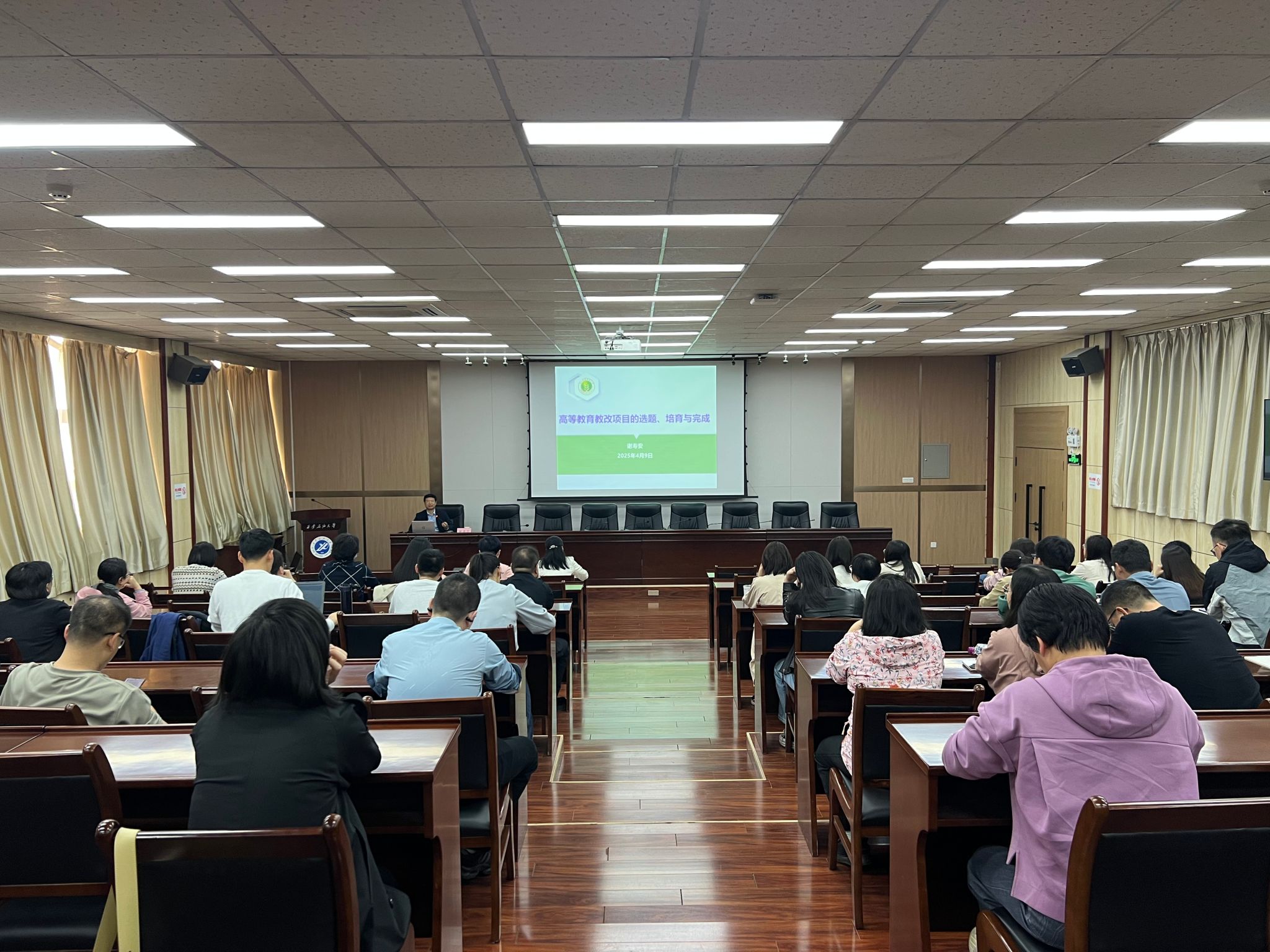 謝教授以《高等教育教改項目的選題、培育與完成》為題,以簡潔、生動、精煉的語言,深入剖析了教改項目研究趨勢。他憑借深厚的學術底蘊與豐富的實踐經驗,詳細闡述可宏觀的政策導向到微觀的研究熱點轉變,結合實際案例講解了教改項目“6書”在項目推進中的關鍵作用及撰寫要點。