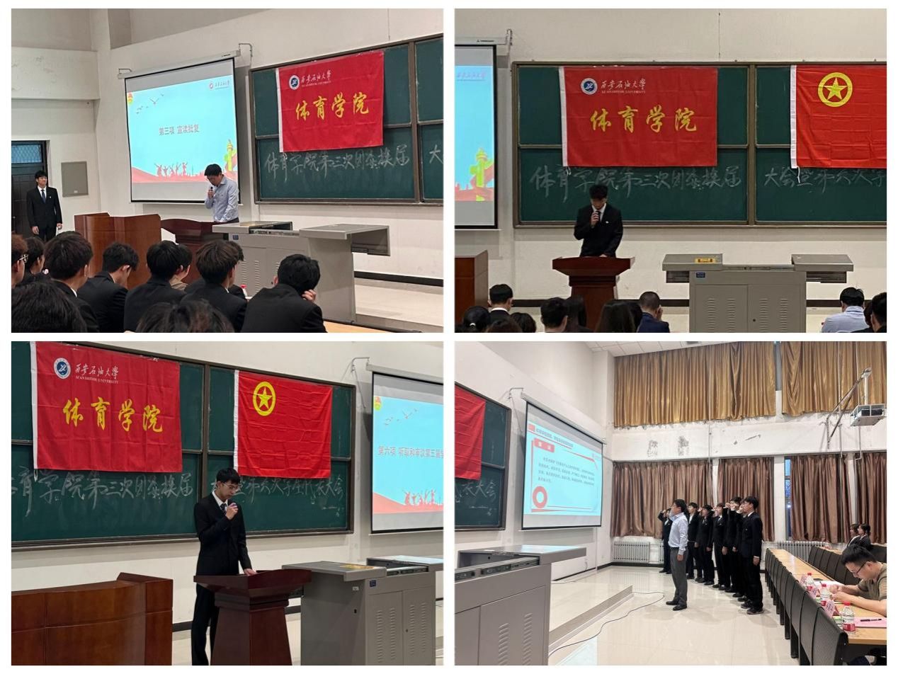 體育學院團委書記姜國平宣讀了校團委《關于同意召開共青團西安石油大學體育學院第三屆委員會屆內調整暨第六次學生代表大會的批復》。隨后,大會聽取和審議了籌備工作組組長魯佳鑫作的《體育學院第三屆團委委員會屆內調整暨第六次學生代表大會籌備工作報告》和第五屆學生會輪值主席劉思宇作的《體育學院第五屆學生會工作報告》。按照大會議程和選舉辦法,經民主投票分別選舉產生了體育學院新一屆團委委員和學生會委員會委員,全體新當選委員在姜國平老師的帶領下面向團旗進行了莊嚴宣誓。