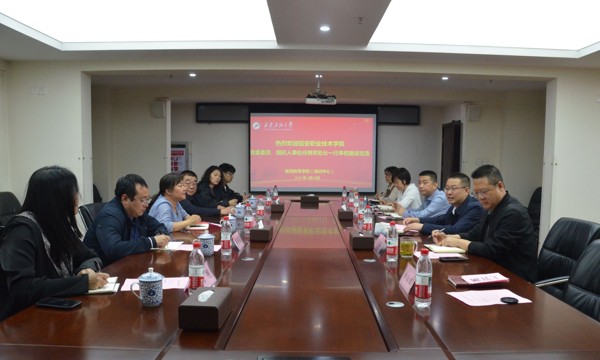 為共同推動繼續教育事業發展,加強校際間的合作與交流,4月18日下午,延安職業技術學院黨委委員、組織人事處處長(統戰部部長)任艷芳、繼續教育學院院長惠延東等一行6人來我校繼續教育學院(培訓中心)座談交流,就學歷教育、培訓教育、同等學力申碩等方面進行了深入的交流。