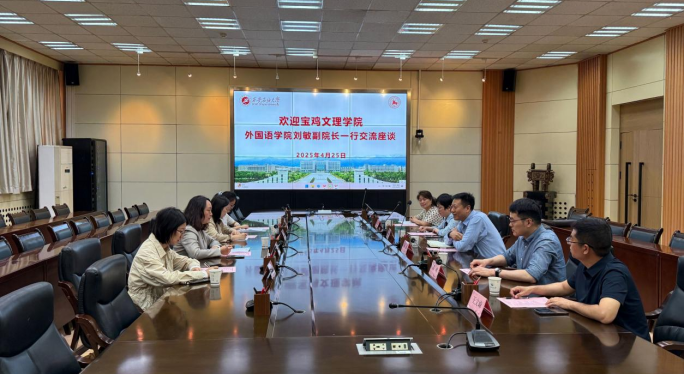 4月25日上午,寶雞文理學院外國語學院劉敏副院長帶隊來我校外國語學院座談交流。座談交流會在雁塔校區會議中心第二會議室召開,外國語學院副院長陳武、翻譯碩士學位點負責人鄧林、翻譯碩士教學與研究中心主任陳柯、研究生公共外語教學部主任張虹、英語系黨支部書記王文峰參加座談會。座談會由外國語學院副院長陳武主持。