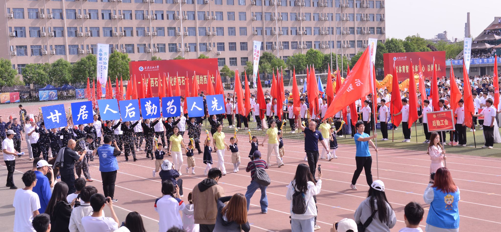 4月25日,在鄠邑校區東體育場舉辦的我校第四十四屆田徑運動會圓滿收官。后勤處工會代表隊憑借默契配合和奮勇拼搏,再次摘得教職工運動會團體總分桂冠,用實力詮釋后勤隊伍的昂揚風貌。