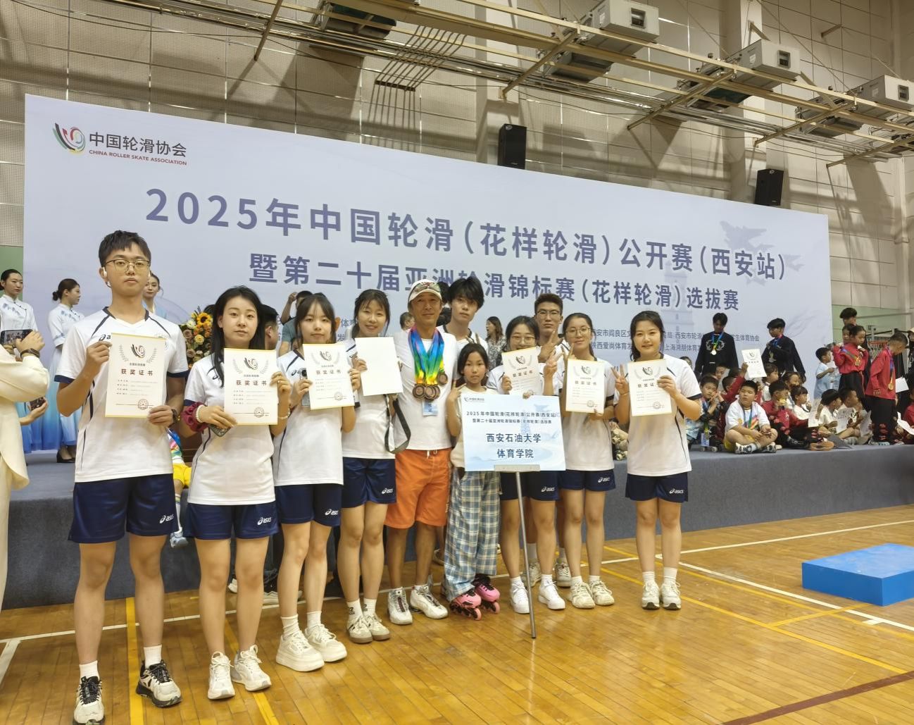 5月2日,2025年中國輪滑(花樣輪滑)公開賽(西安站)暨第二十屆亞洲輪滑錦標賽(花樣輪滑)選拔賽在閻良文化體育中心開賽,共有來自陜西、上海、廣州、湖北、吉林等地的20支輪滑隊、140余名選手參賽。本次比賽,我校體育學院院長李壽邦擔任領隊、校輪滑隊主教練陳亮擔任教練,帶領9名隊員參加了成年組團隊方陣輪滑的比賽。