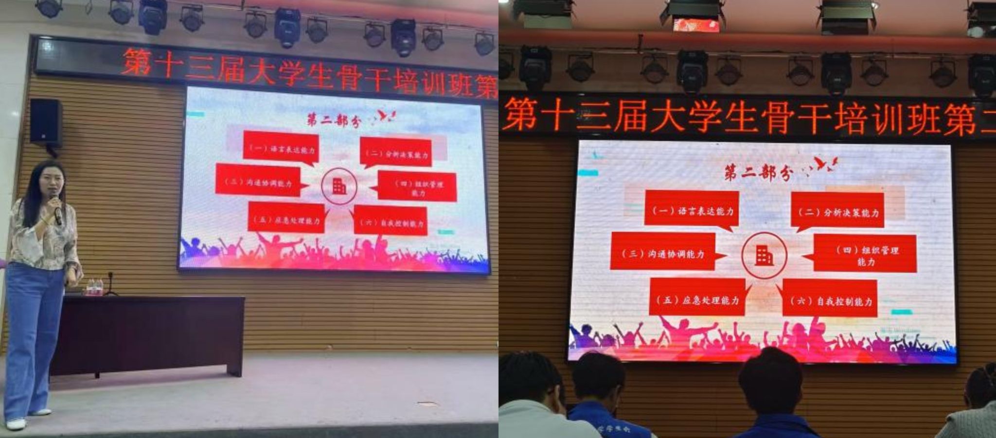 4月22日,培訓班第二講邀請校團委組織部部長付強作為主講嘉賓,她圍繞學生干部的初心與能力提升展開培訓,強調理想信念的重要性,并提出學生干部應具備語言表達、分析決策、溝通協調、組織管理、應急處理、自我控制六大核心能力。