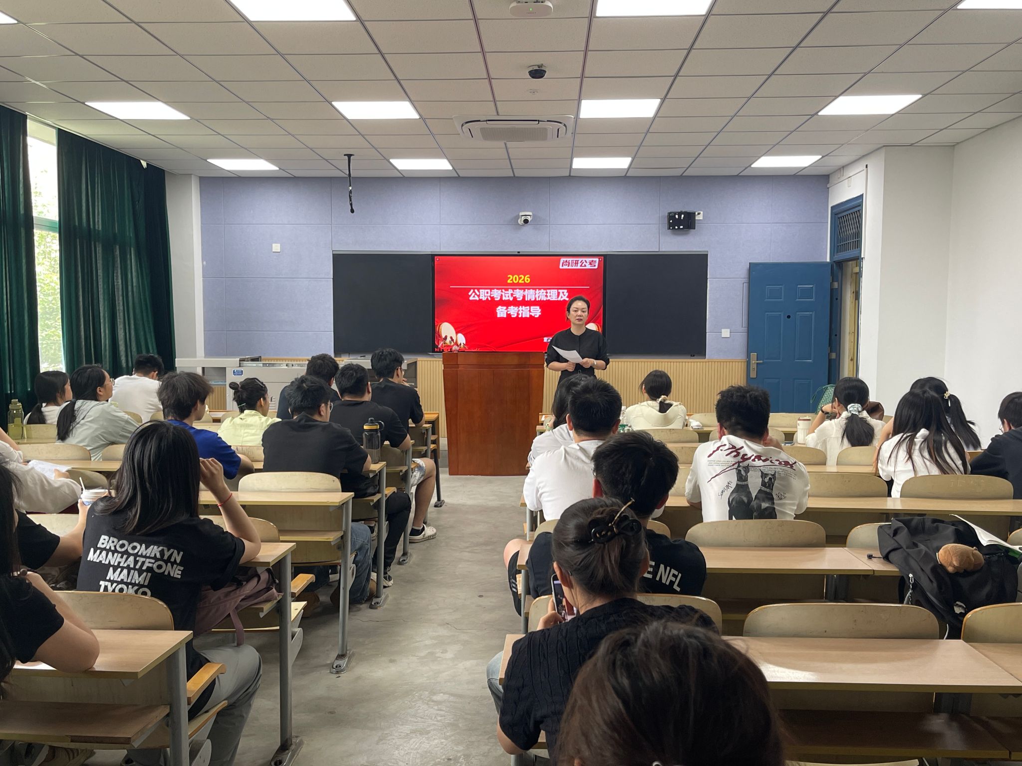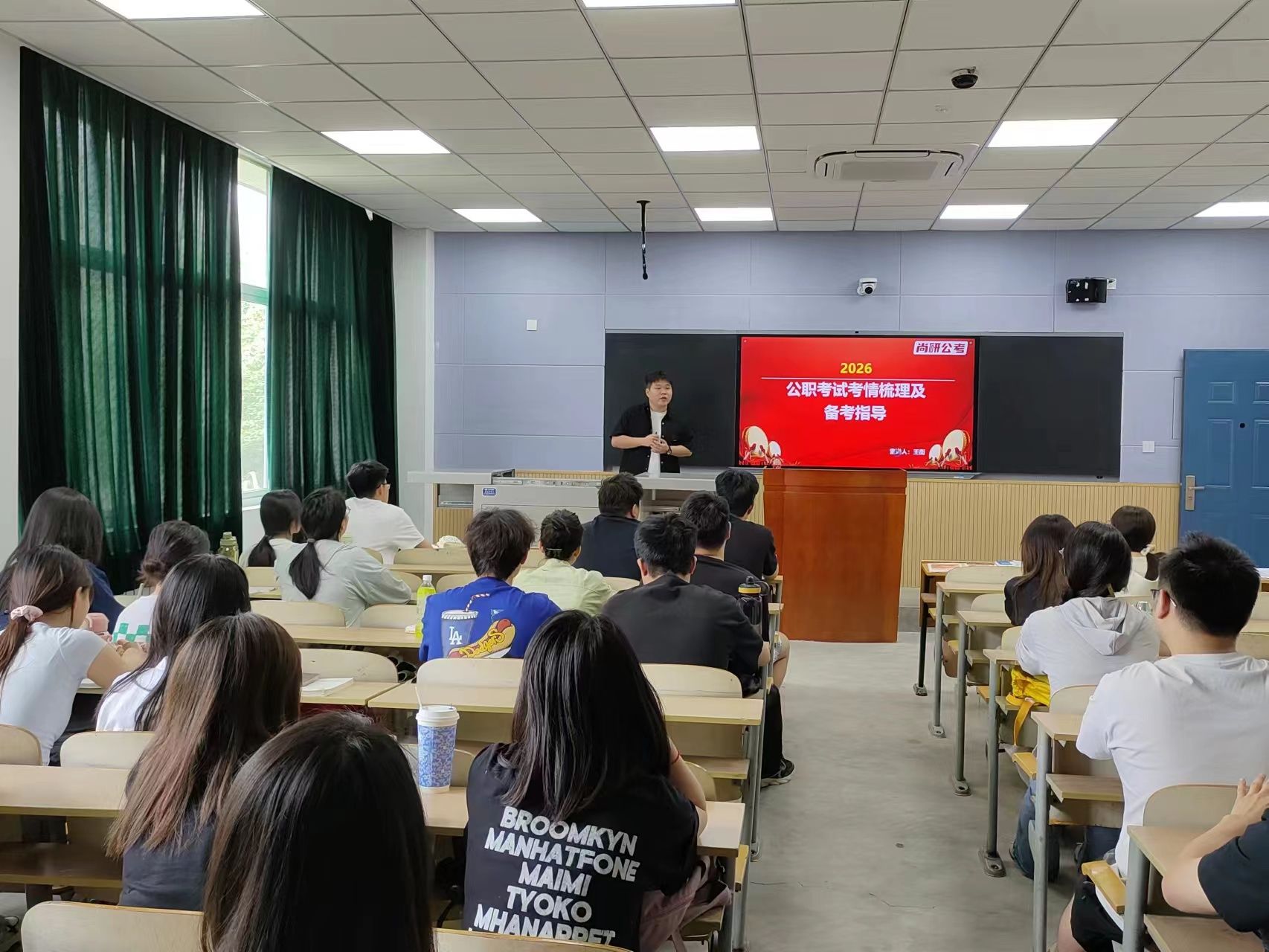為助力2026屆畢業生科學備戰公務員考試,精準把握考情趨勢,提升應試能力。5月7日下午,人文學院在博覽樓A105舉辦“2026年公職考試考情梳理及備考指導”專題講座。本次活動由人文學院聯合尚研公考共同發起,人文學院黨委副書記盛丹、尚研公考名師王蘅、2021級輔導員張馨元出席活動,人文學院與經管學院意向考公學生到場參與。