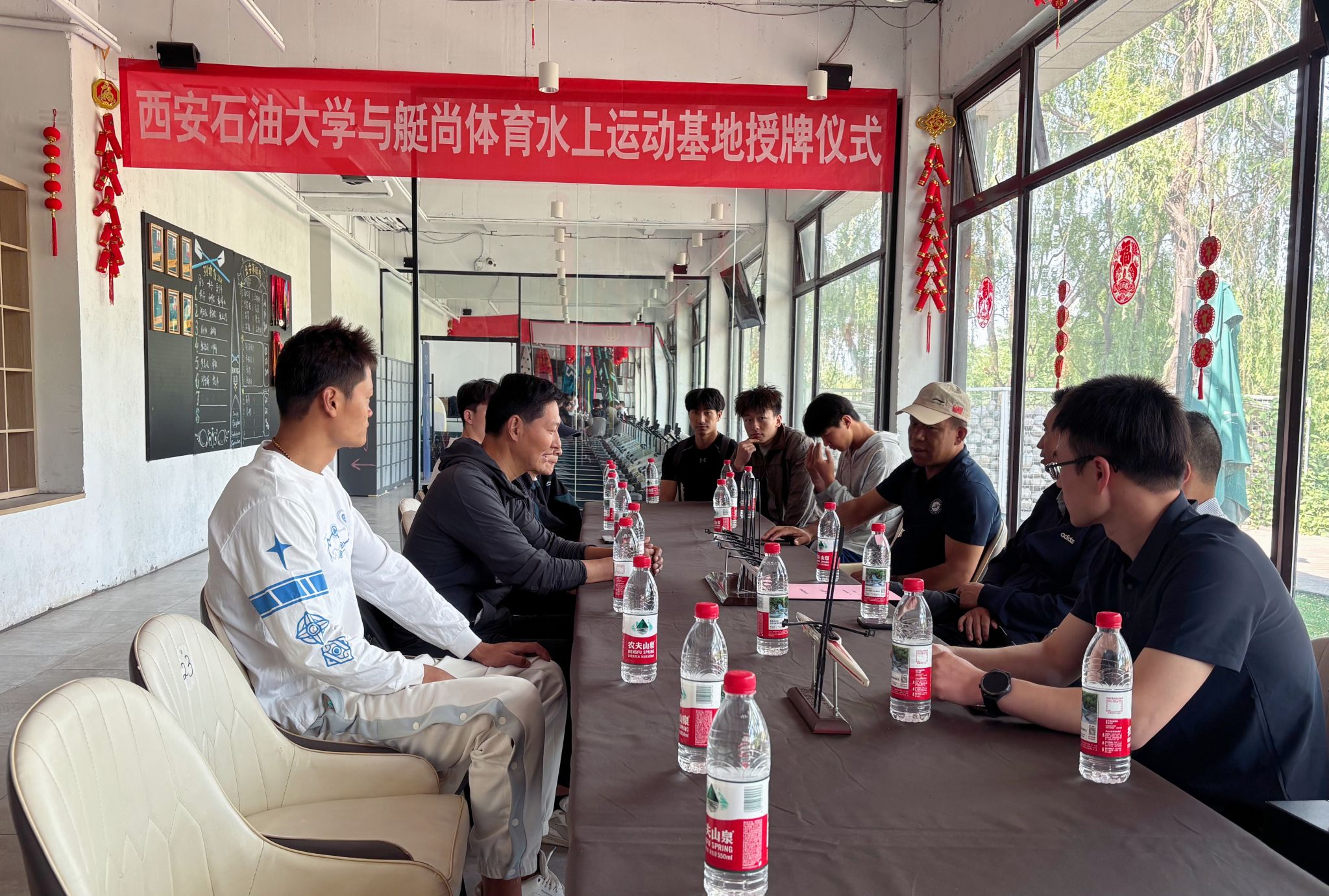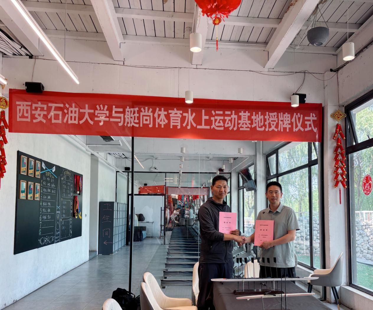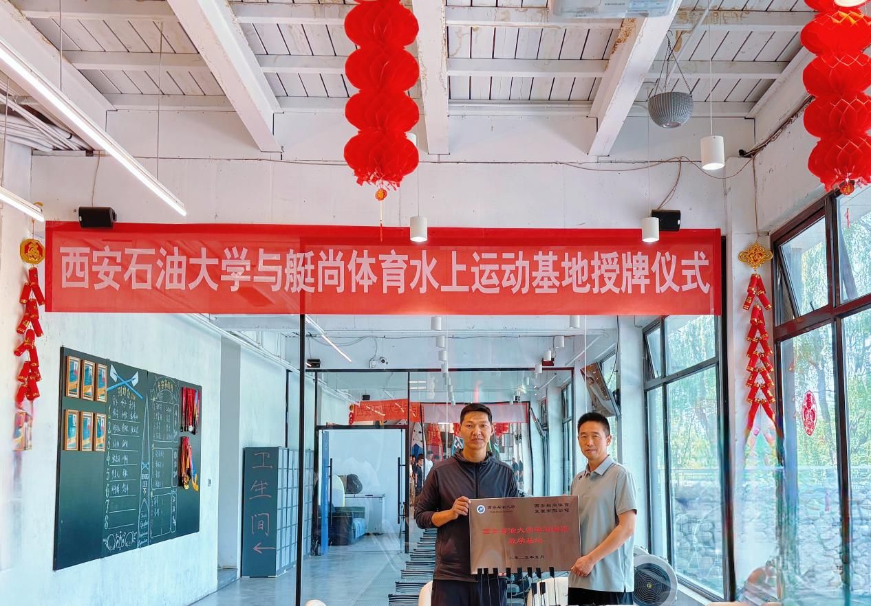 簽約儀式結束后,雙方代表共同為“西安石油大學體育學院實習實踐教學基地”揭牌,與會人員并實地考察了艇尚體育的水上訓練場地,觀摩了正在進行訓練的西安石油大學賽艇隊。正如學校賽艇隊冀兆鵬教練所說:“過去我們教授水上運動僅停留在理論層面,現在學生能直接參與真實賽事籌備,這種沉浸式學習將大幅提升他們的職業競爭力。”
