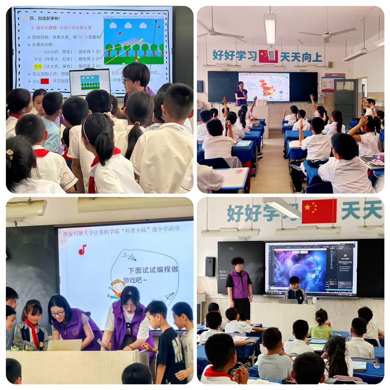 活動當天,學院組織的四支科普宣講小隊分別走進不同班級,結合小學生的年齡特征和學習興趣,精心設計教學內容和互動環節,通過“知識講解+趣味游戲+人機互動”相結合的方式,向孩子們生動講述計算機的發展歷程、智能應用、人工智能等前沿知識,讓科技理念以貼近生活、通俗易懂的方式走進小學生,在潛移默化中點燃他們探索科技的熱情。