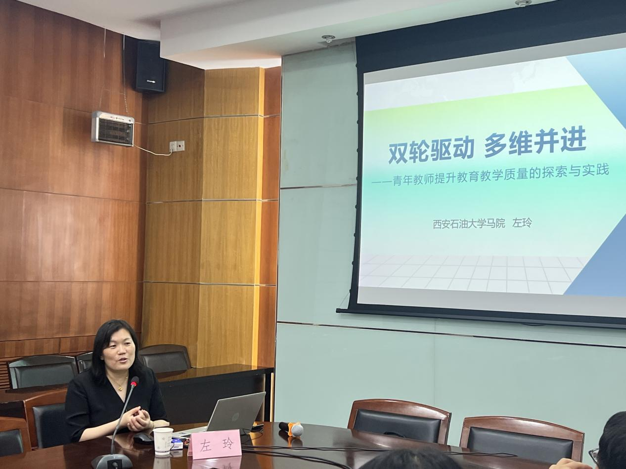 馬克思主義學院左玲教授作題為“雙輪驅動 多維并進——青年教師提升教育教學質量的探索與實踐”主題分享,她圍繞教育變革背景下青年教師的時代使命、提升教育教學質量的“1+2+3”路徑模式、青年教師未來發展的破界進階三大問題,聚焦“1”個核心能力、“2”個驅動引擎和“3”個支撐體系,結合20余年的從教經驗與實踐案例,分享了自己豐富的課堂教學經驗以及省級思政課教師“大練兵”活動參賽經驗,探討青年教師如何從“破壁者”轉向“融合者”、邁向“引領者”的成長規劃與躍升策略,為與會教師提供了明晰的發展思路和有益的教學科研經驗建議,助力青年教師在教學創新、科研轉化、社會服務中實現高質量發展。