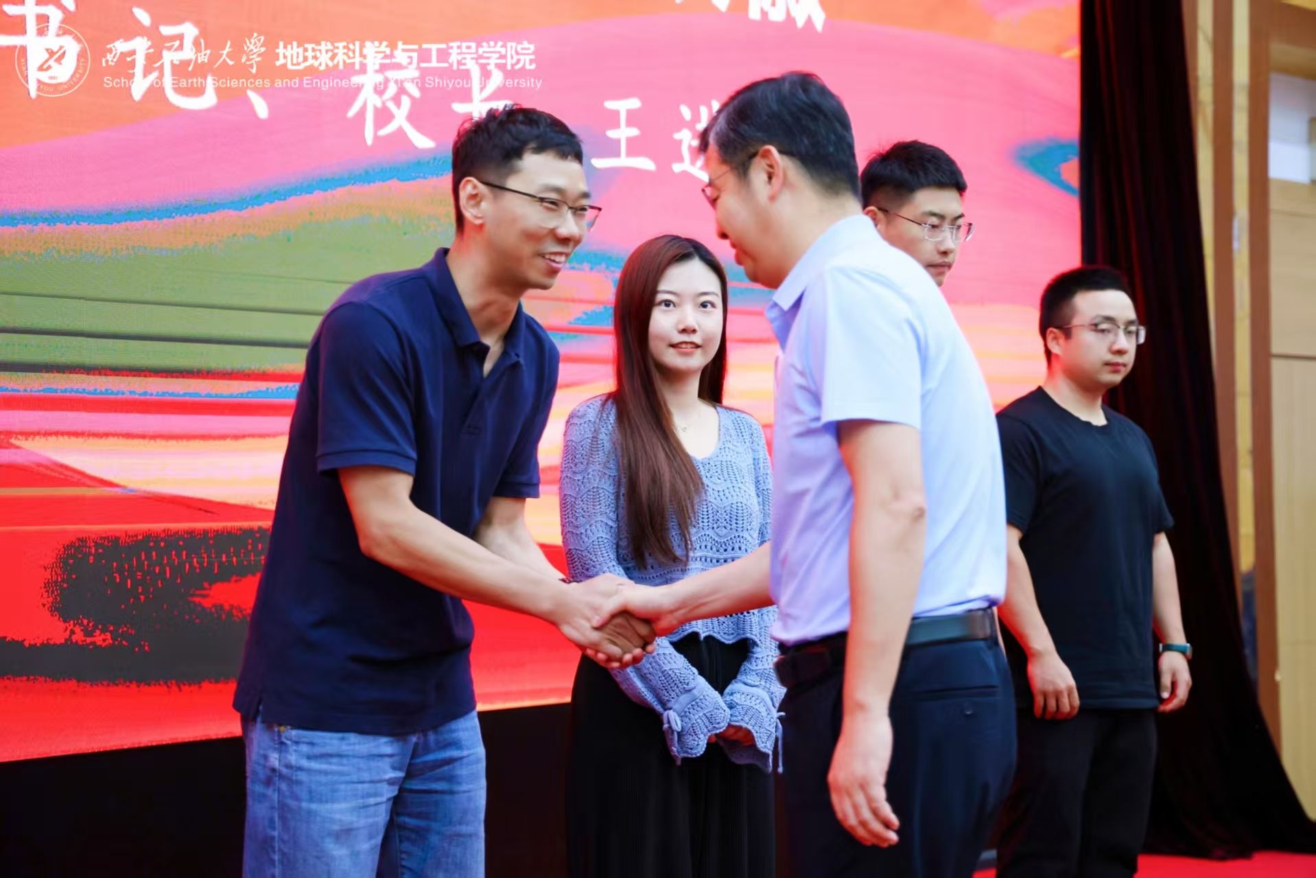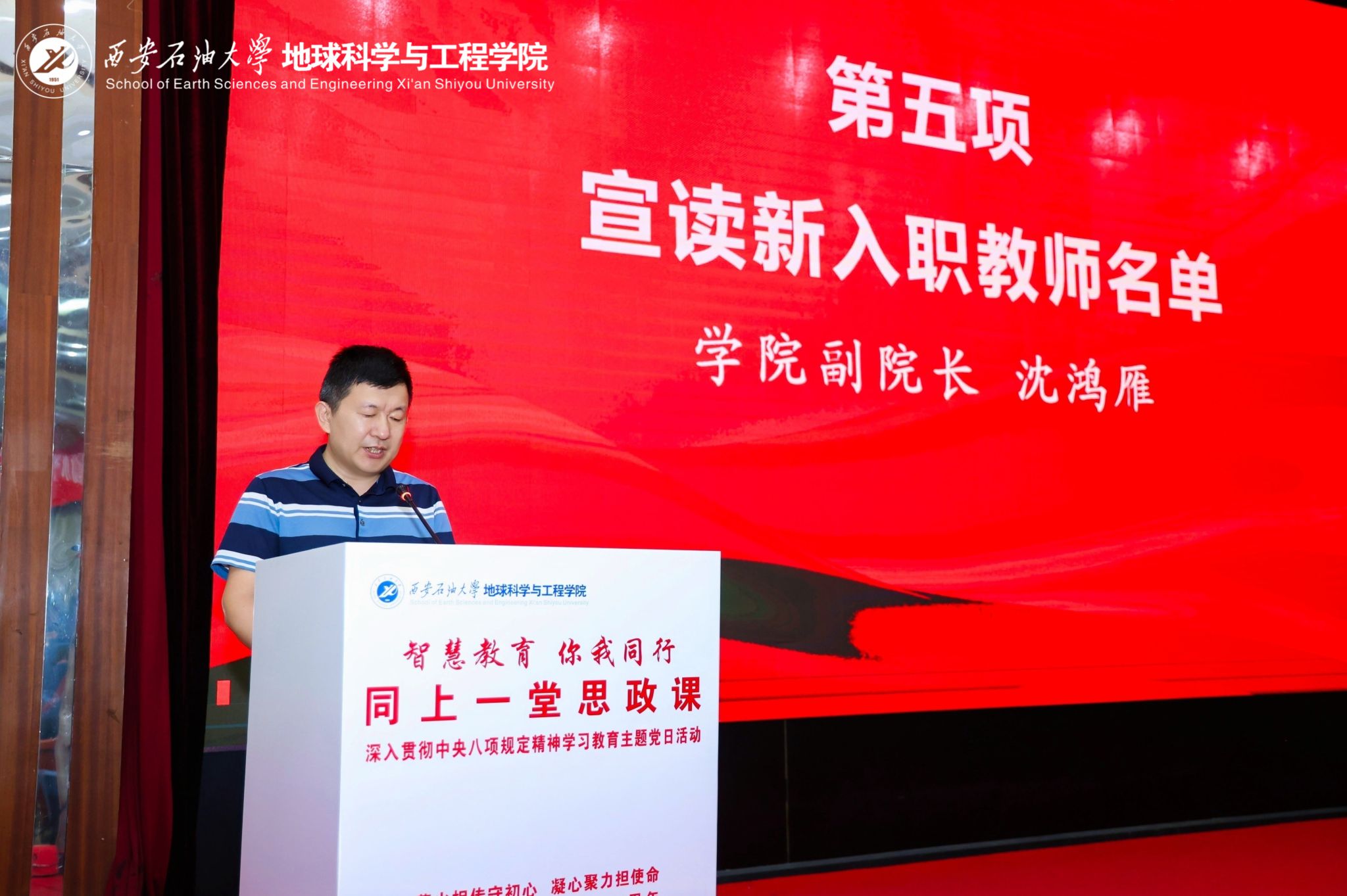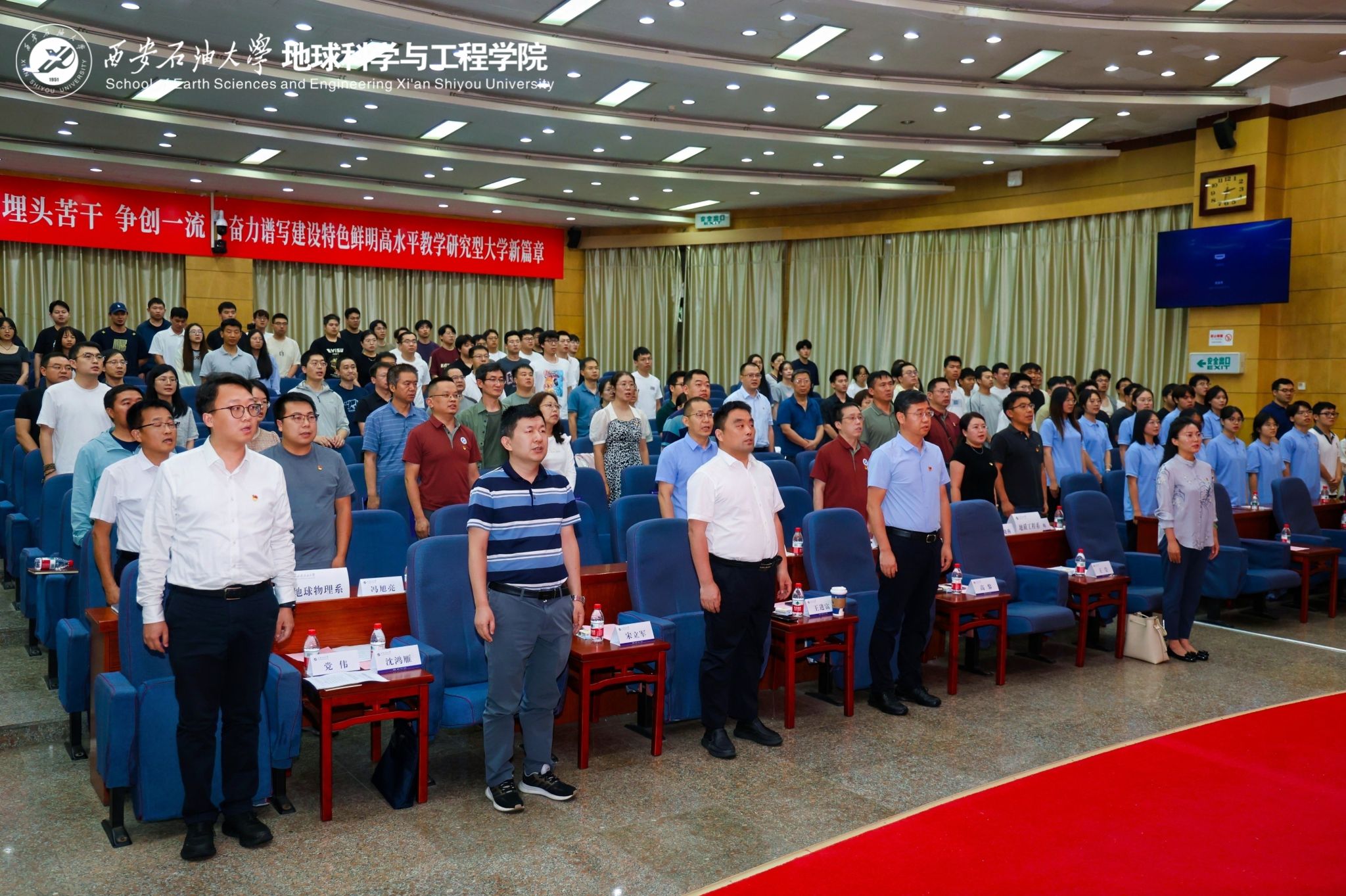 在慶祝中國共產黨成立104周年,深入貫徹中央八項規定精神學習教育走深走實和貫徹落實學校“三個年”建設部署之際,6月30日下午,地球科學與工程學院黨委在雁塔校區學術報告廳舉行“智慧教育 你我同行”同上一堂思政課暨深入貫徹中央八項規定精神學習教育主題黨日活動。校黨委副書記、校長王進富出席活動并講授思政課暨學習教育專題黨課。學院黨政領導班子成員,黨委委員、理論學習中心組成員,各系黨支部書記、主任,師生員工及黨員代表等200余人參加。活動由學院黨委書記高黎主持。