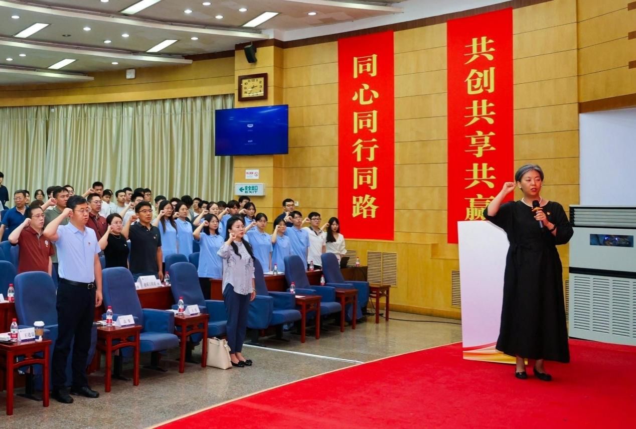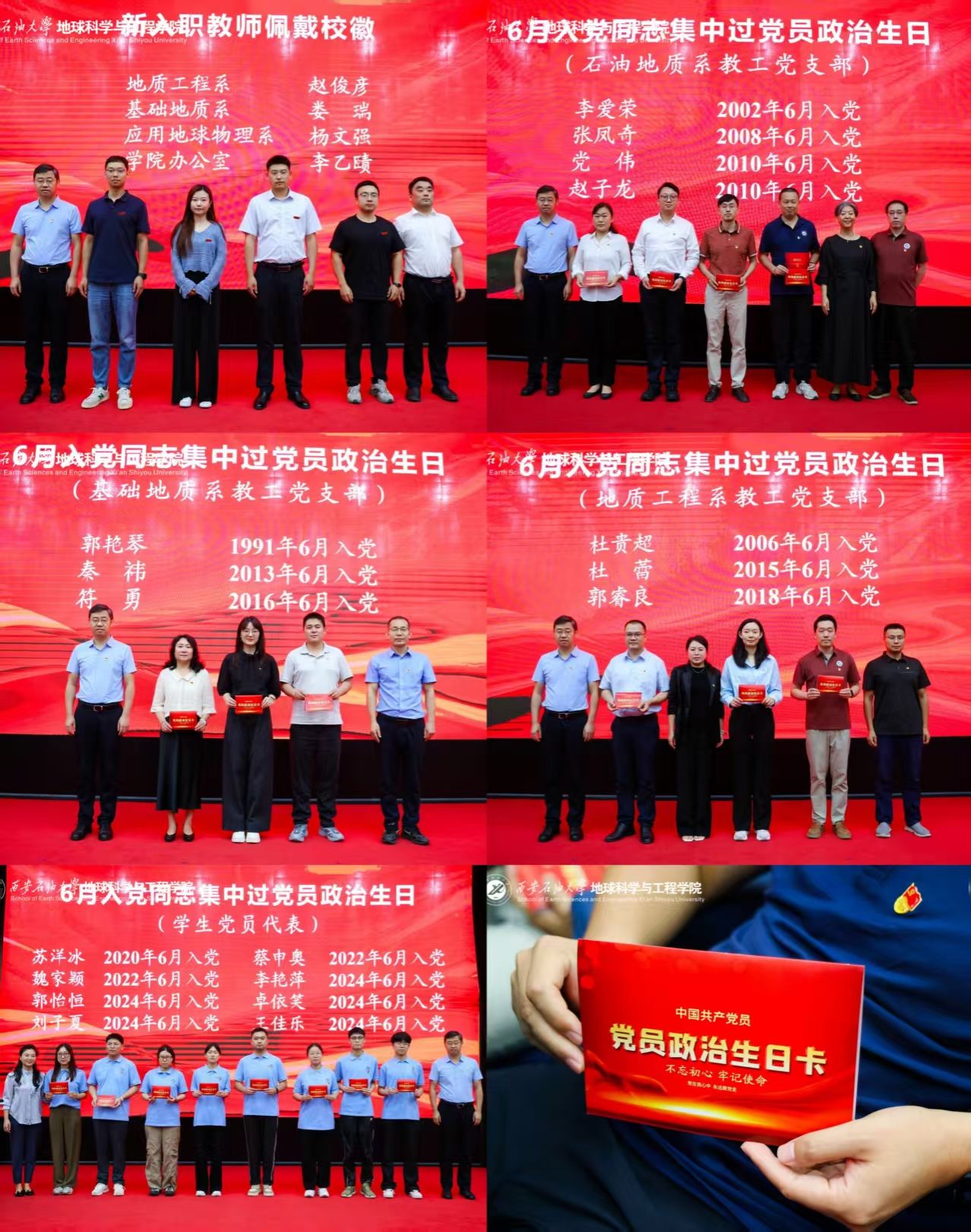 學院副院長沈鴻雁宣讀學院新入職教師名單。學院院長宋立軍等與會領導為新進教師佩戴校徽,象征教育薪火相傳。在集中過政治生日環節,校院領導與各系黨支部書記、主任為6月入黨的師生黨員代表頒發黨員政治生日卡,進一步強化身份認同,激發使命擔當。