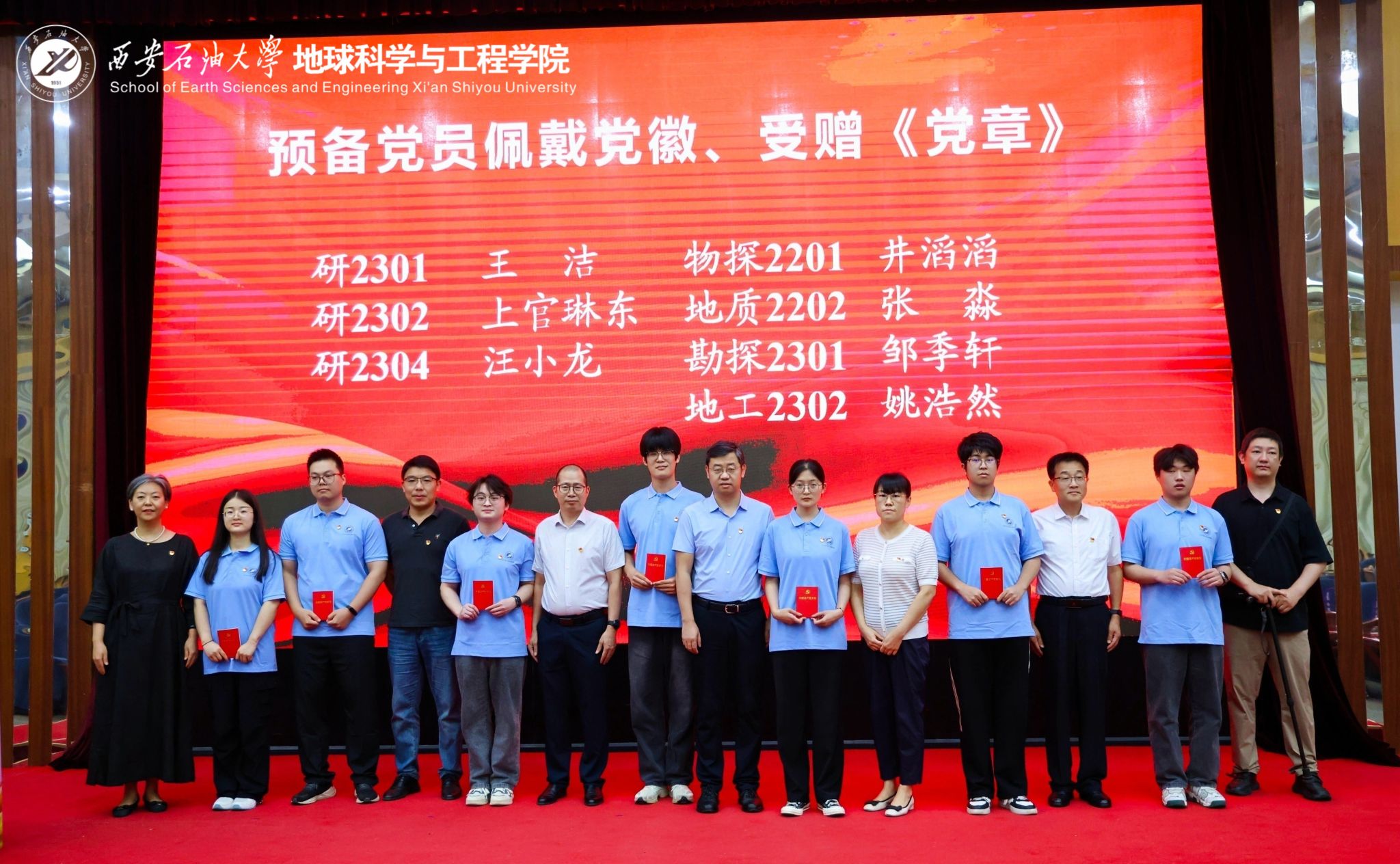 莊嚴儀式強信念,初心如磐擔使命。學院黨委副書記王瑩宣讀預備黨員名單。在高黎同志的領誓下,新黨員面向黨旗莊嚴宣誓,老黨員重溫入黨誓詞。鏗鏘誓言響徹會場,表達了學院黨員的赤誠信念。會場非黨員師生共同肅立,觀禮見證。王進富同志同學院各黨支部在教學科研和管理服務一線工作多年、黨齡較長的黨員代表,為預備黨員代表佩戴黨徽并贈送黨章,激勵他們牢記黨員身份,踐行初心使命。