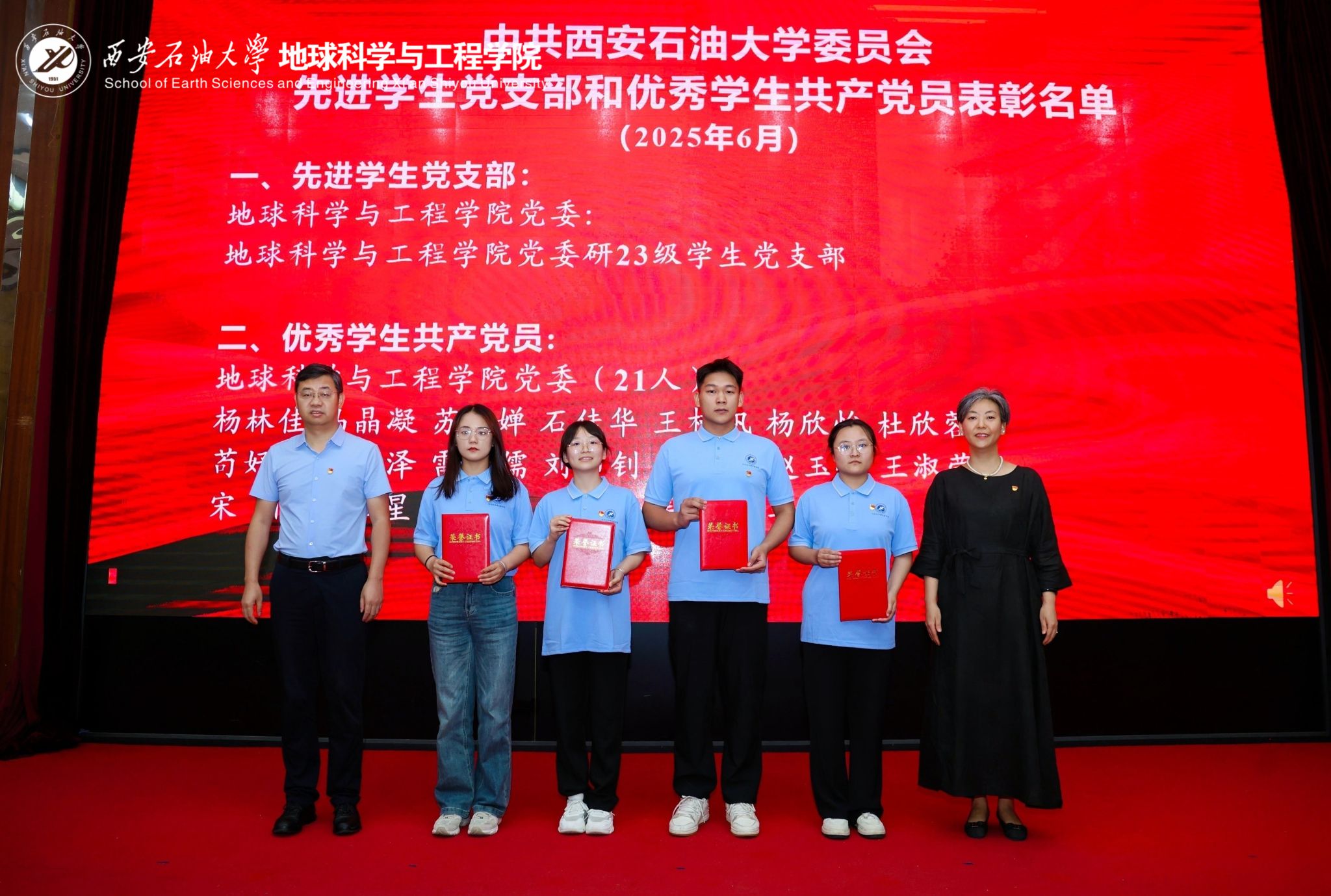 表彰先進樹典型,砥礪奮進再出發。學院副院長黨偉宣讀2025年先進學生黨支部和優秀學生共產黨員表彰名單。校院領導為獲獎代表頒發榮譽證書,勉勵受表彰的集體和個人珍惜榮譽,再接再厲,爭當先鋒、爭做表率。