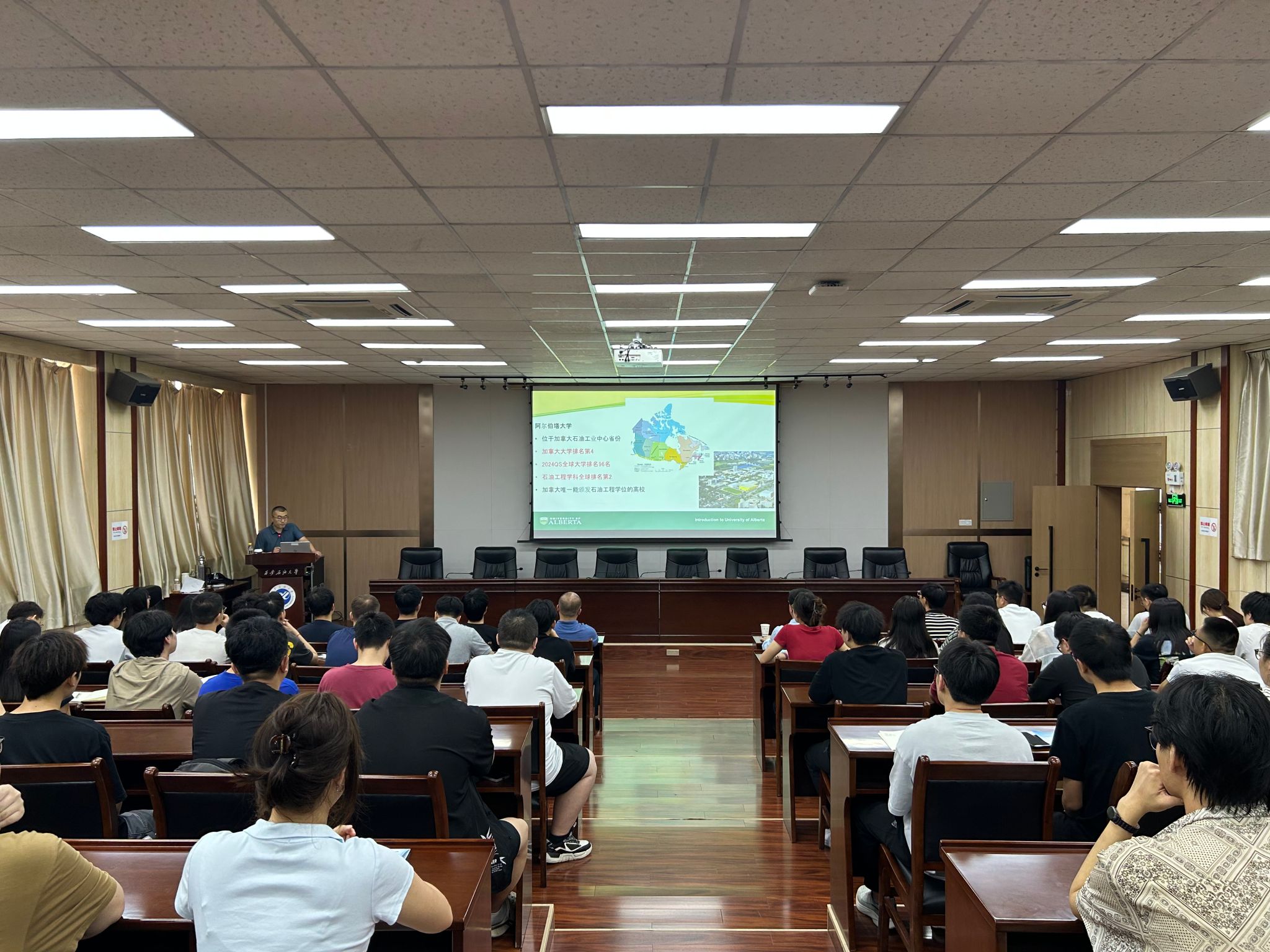 李華周教授圍繞氣驅提高采收率原理,系統總結了狀態方程的發展歷程與研究現狀,詳細介紹了研究團隊在狀態方程改進、多相平衡理論、多相包絡線計算程序開發方面取得的重要突破和“嫁接法”與“轉移法”等創新性成果。同時,就阿爾伯塔大學基本情況、招生政策及與國內高校合作交流情況進行了介紹,鼓勵我校學子積極申請該校博士碩士項目,進一步拓寬國際視野。