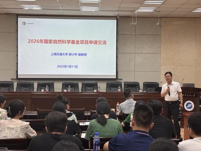 隨后,薛小懷以“2026年國家自然科學基金項目申請交流”為題,結合自身評審經驗,從國家自然科學基金項目申請要做的兩件事、基礎研究的本質、自然基金申請的本質、自然基金申請中標的三個要素等七個方面展開,重點介紹了申請基金應該注意的關鍵問題,并圍繞基金申報與在場師生展開了深入交流。