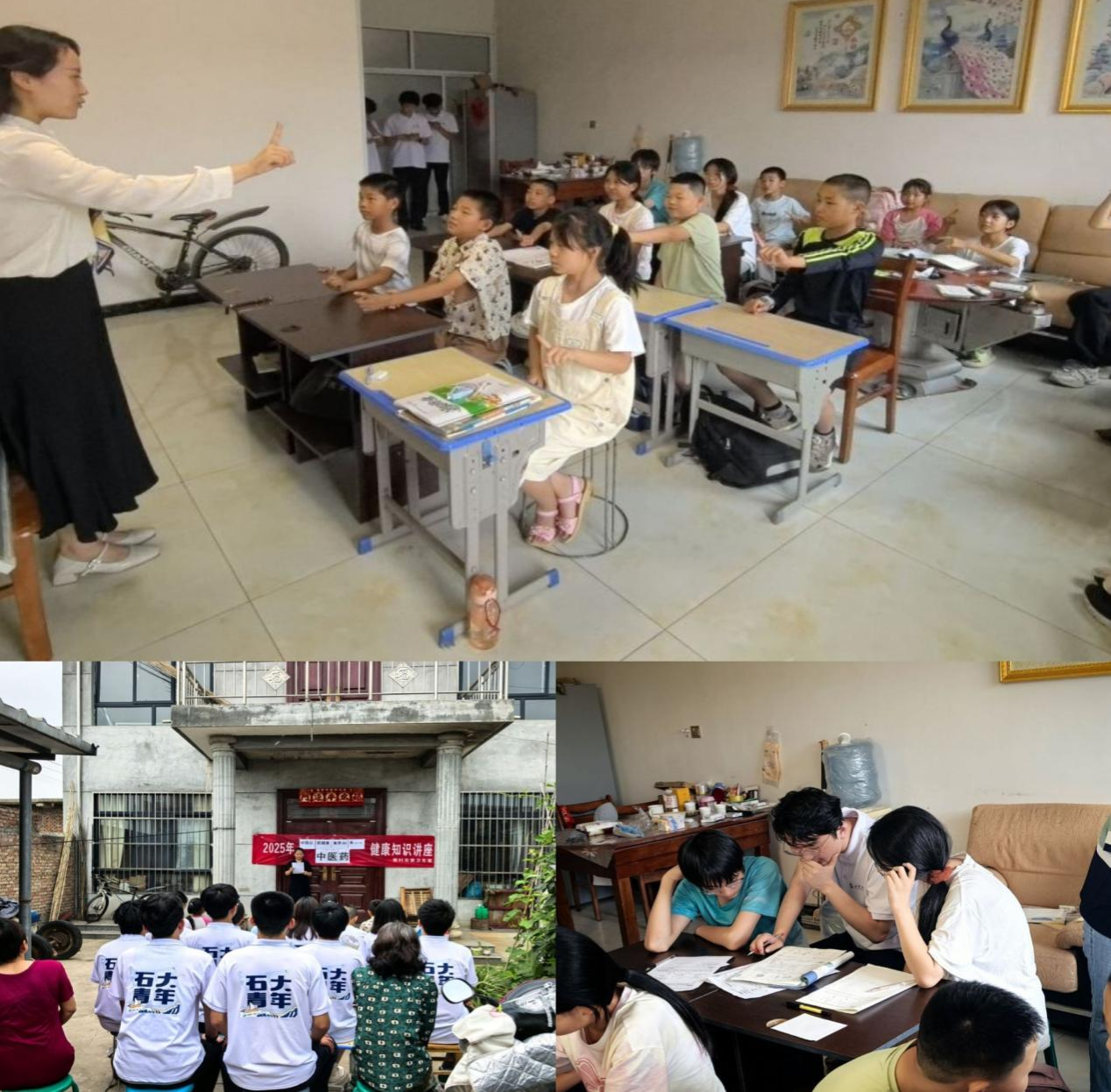 7月9日,團隊聯合村醫在村醫療站旁廣場開展醫療健康宣傳活動,村醫現場演示口罩佩戴、體溫測量等技能,并發放消毒濕巾,守護兒童健康。