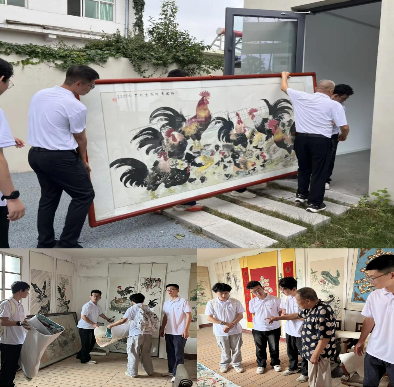 7月7日,實踐團探訪國家級非遺傳承人段桂榮老人的畫室,了解關中農民畫的文化內涵與藝術價值。老人創作的《牡丹小雞》等作品,以公雞象征勤勞與希望,展現了深厚的鄉土文化底蘊。實踐團協助將老人耗時三月完成的巨型公雞畫移送至村傳統文化紀念館,助力非遺文化的保護與展示。隊員們表示,將積極搭建橋梁,推動傳統技藝在當代煥發新活力。