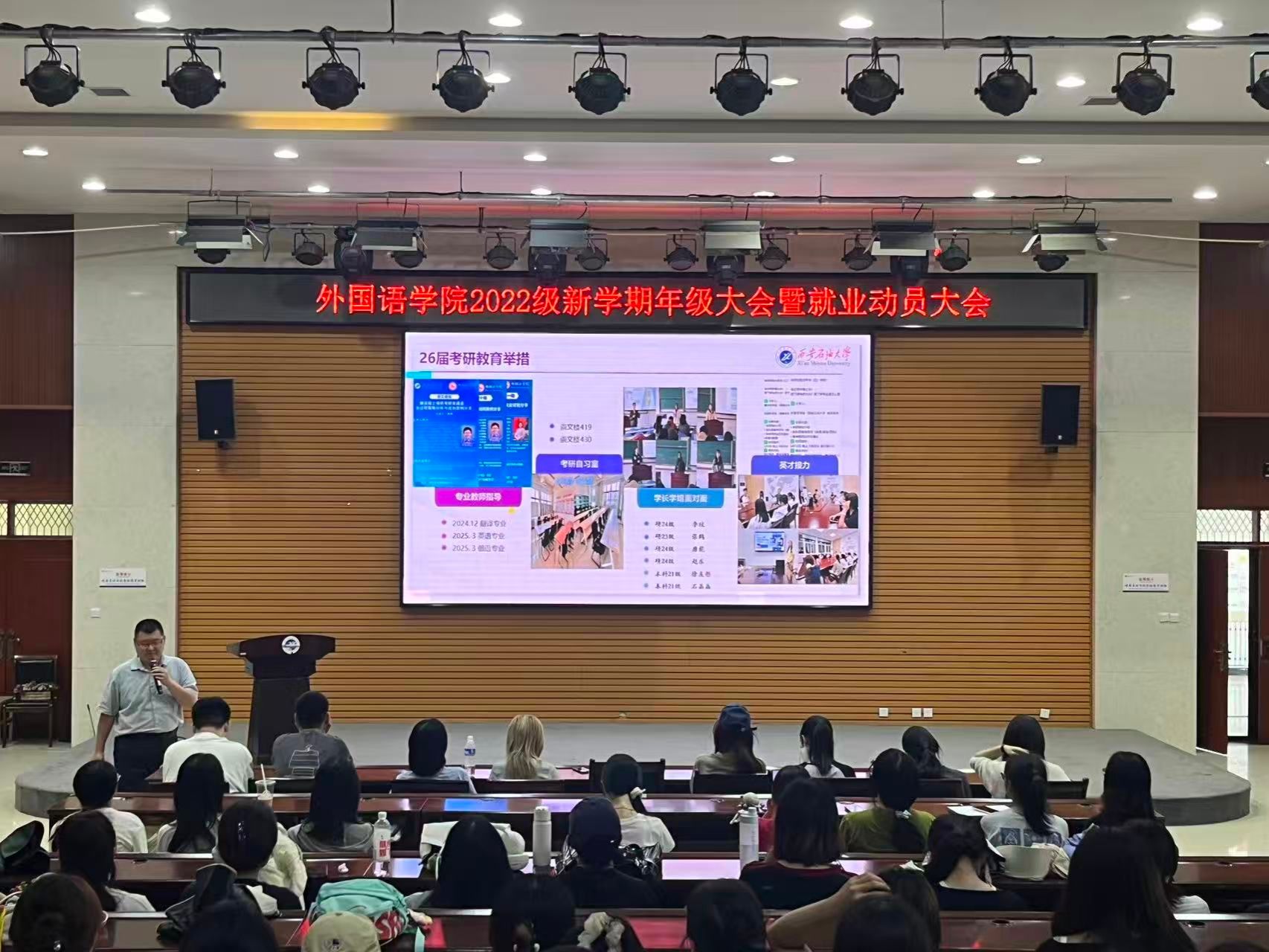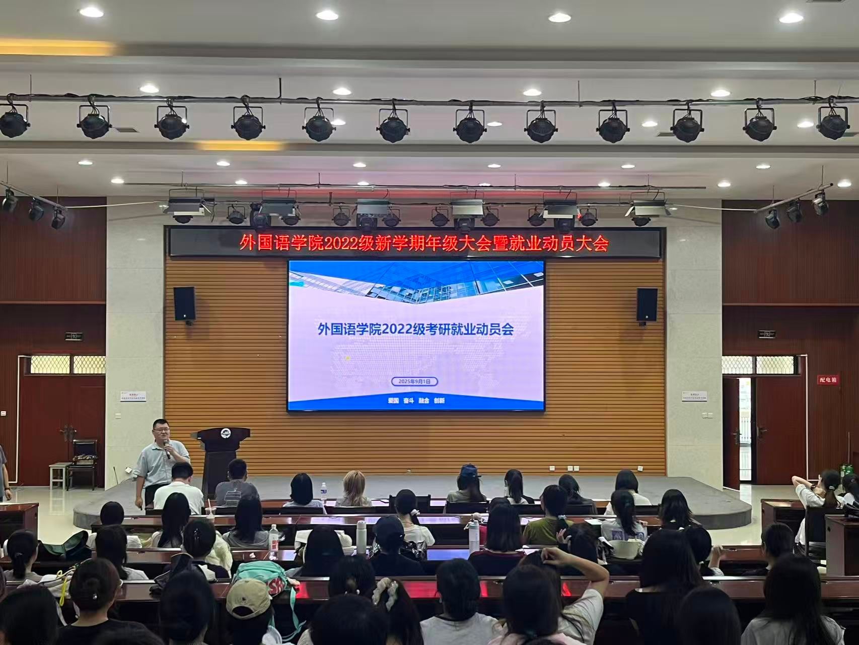 為貫徹落實學校工作要求,引導畢業生樹立正確就業觀念,提高就業積極性和主動性,助力畢業生順利求職升學,9月1日,外國語學院在崇文樓108室召開2026屆畢業生就業動員大會。外國語學院黨委副書記、畢業班輔導員、學院畢業生近200人參加會議。會議由院團委書記陳浩主持。