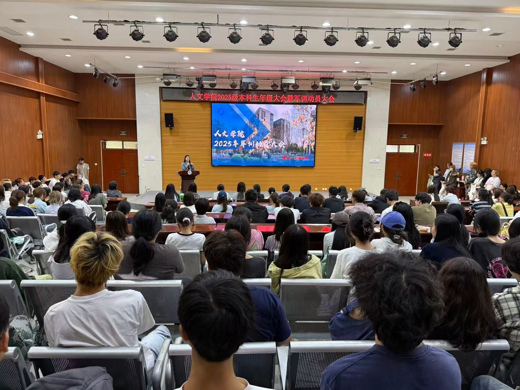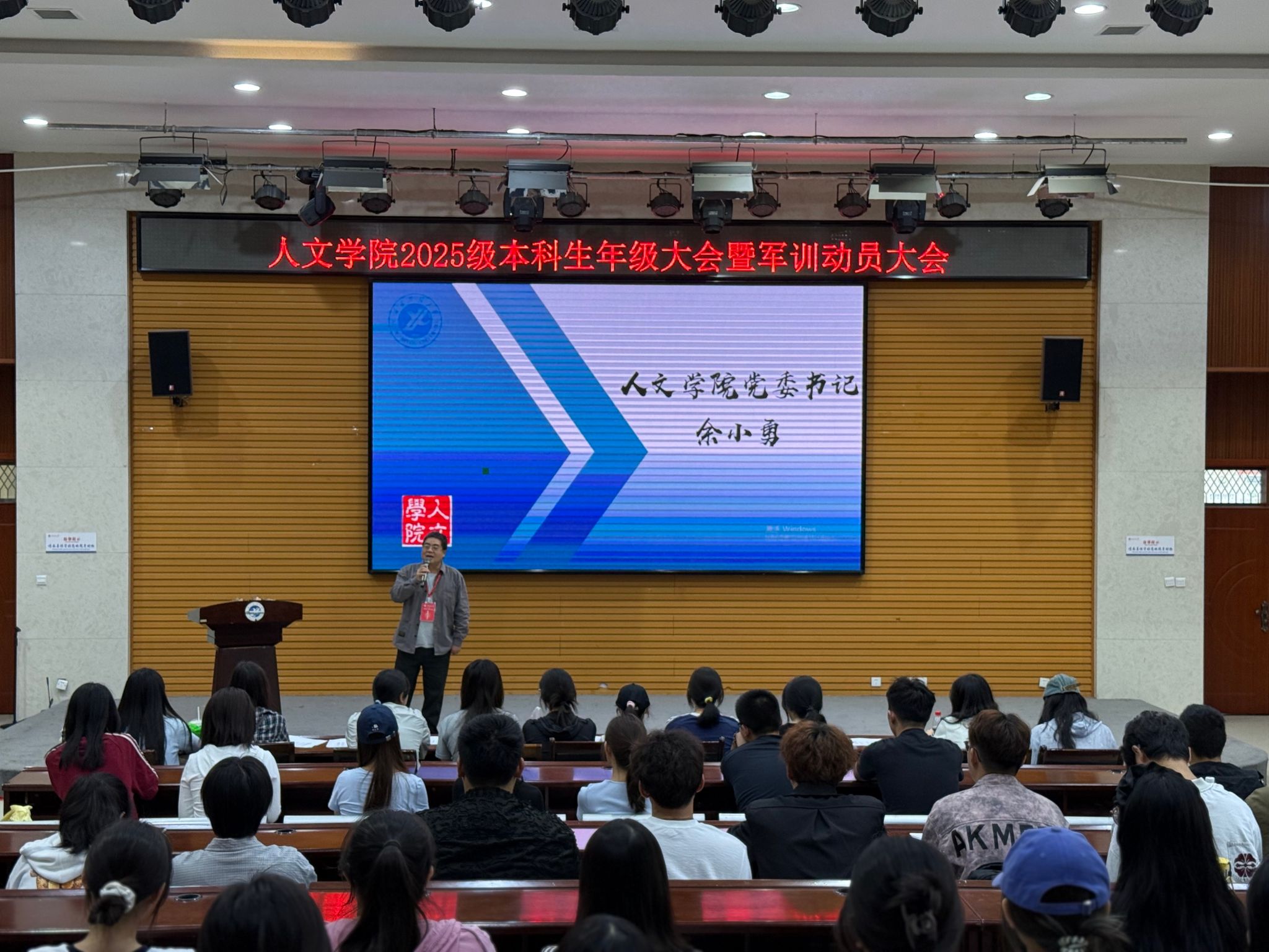 2025年9月6日上午,人文學院2025級本科生年級大會暨軍訓動員大會在鄠邑校區崇文樓118多功能廳順利舉辦。大會由新生輔導員張馨元主持,人文學院黨委書記余小勇出席講話,2025級全體本科新生參會。