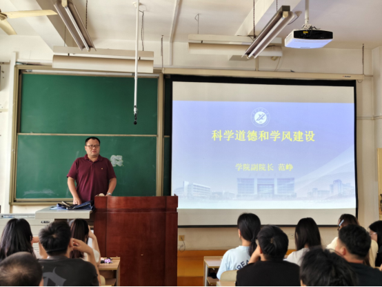 會上,范崢圍繞“科學道德與學風建設”主題展開講解。他結合學術領域典型案例,強調科學道德是科研工作的立身之本,學風建設是研究生培養的關鍵環節,引導新生樹立嚴謹治學、誠信科研的學術觀念,堅決抵制學術不端行為,為未來科研道路筑牢思想根基。