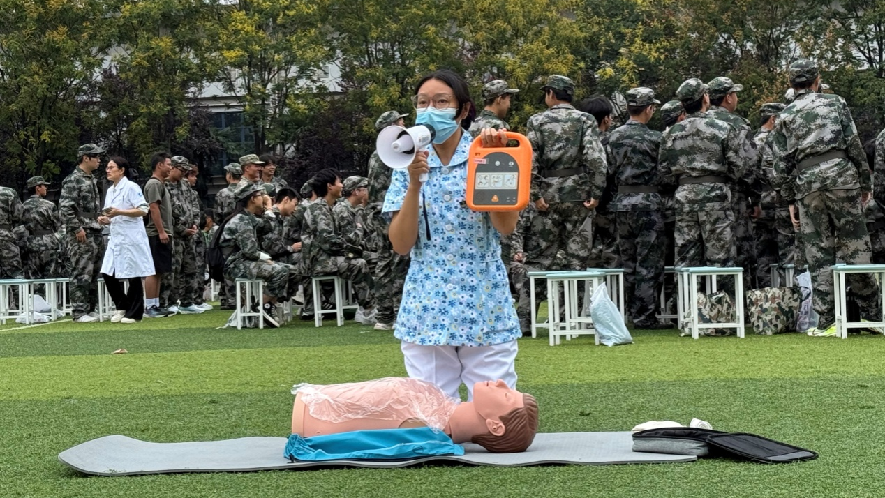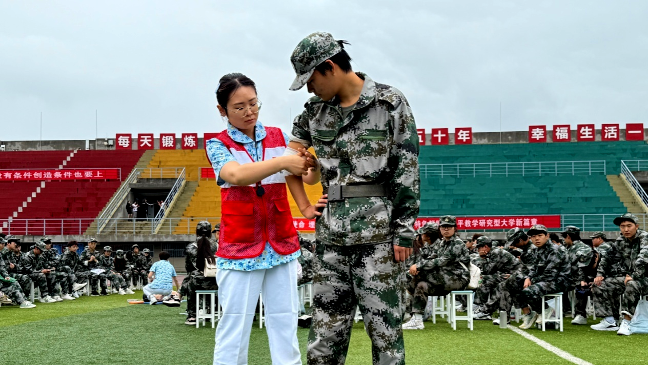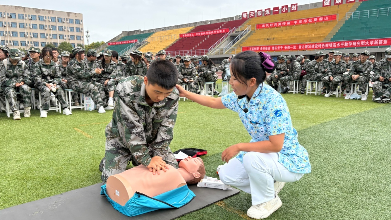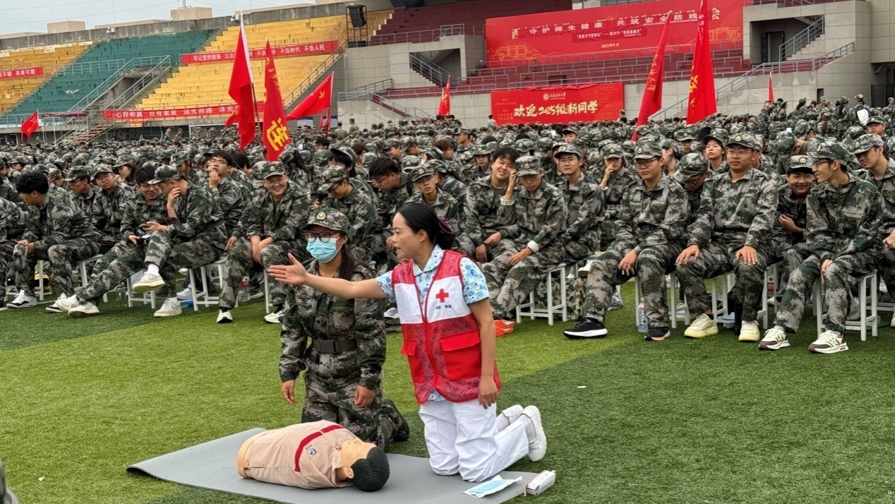 在9月13日第26個“世界急救日”(今年主題為“急救與氣候變化”)到來之際,為助力2025級新生平穩適應大學環境,系統提升其健康防護意識與突發事件應對能力,9月12日,學校武裝部、校醫院攜手鄠邑區紅十字會、鄠邑區疾病預防控制中心,在鄠邑校區東操場聯合開展應急救護培訓、傳染病防治講座及醫保政策科普系列活動。作為新生入學教育的“關鍵第一課”,活動緊密對標學校“全國第三批急救教育試點學校”建設目標,深度踐行“人人學急救,急救為人人”的理念,結合“急救與氣候變化”主題,著力構建系統化、多維度的校園健康保障機制。