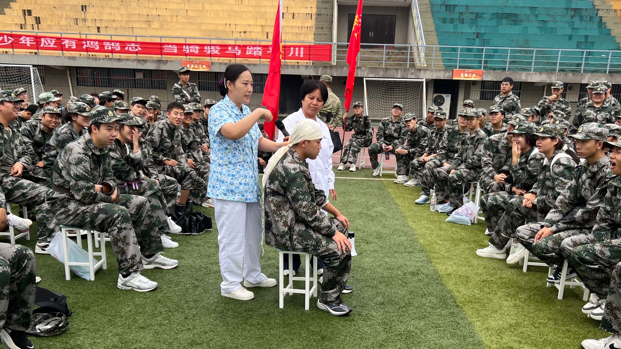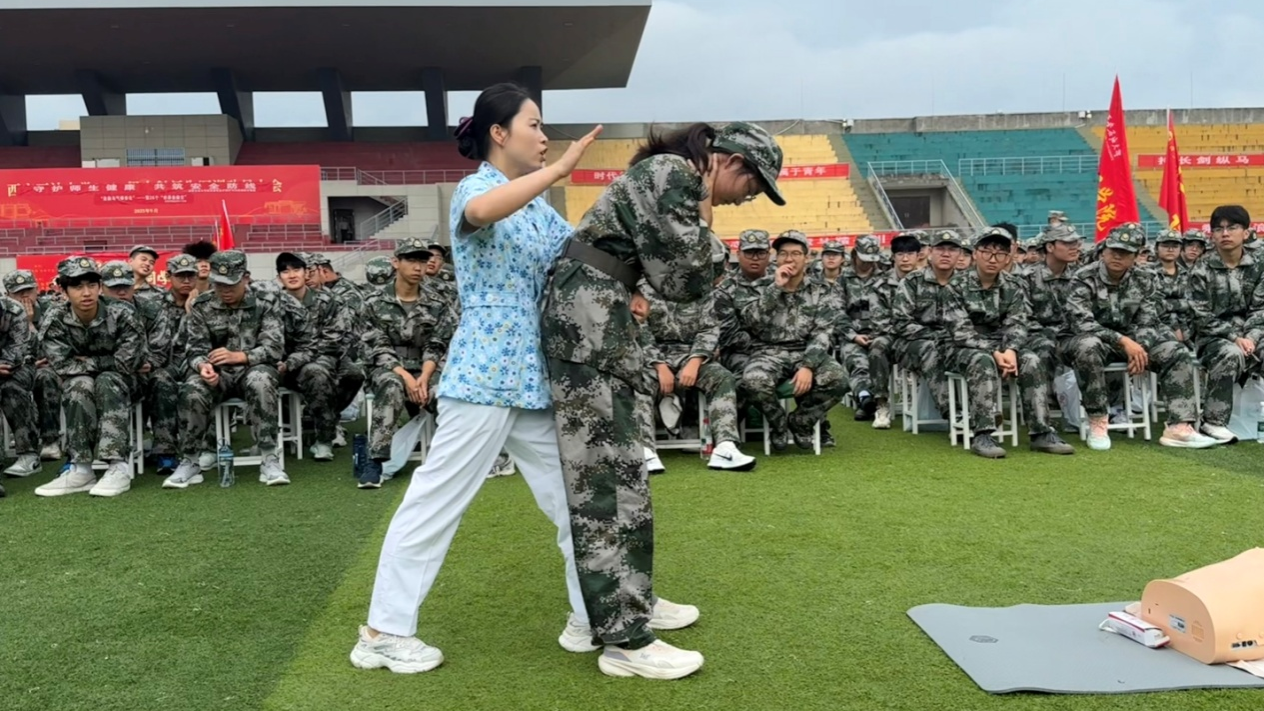 9月12日上午8時,創傷急救演練正式拉開帷幕。在武裝部的統籌協調下,活動前期完成新生分組、場地布置等籌備工作,為演練順利開展提供有力保障。校醫院副院長李文霞主持活動,急救負責人伍曉燕全程駐場指導。演練采用“理論精講+實操實訓”雙軌并行模式,聚焦校園常見意外場景,全方位提升新生應急處置實戰能力。