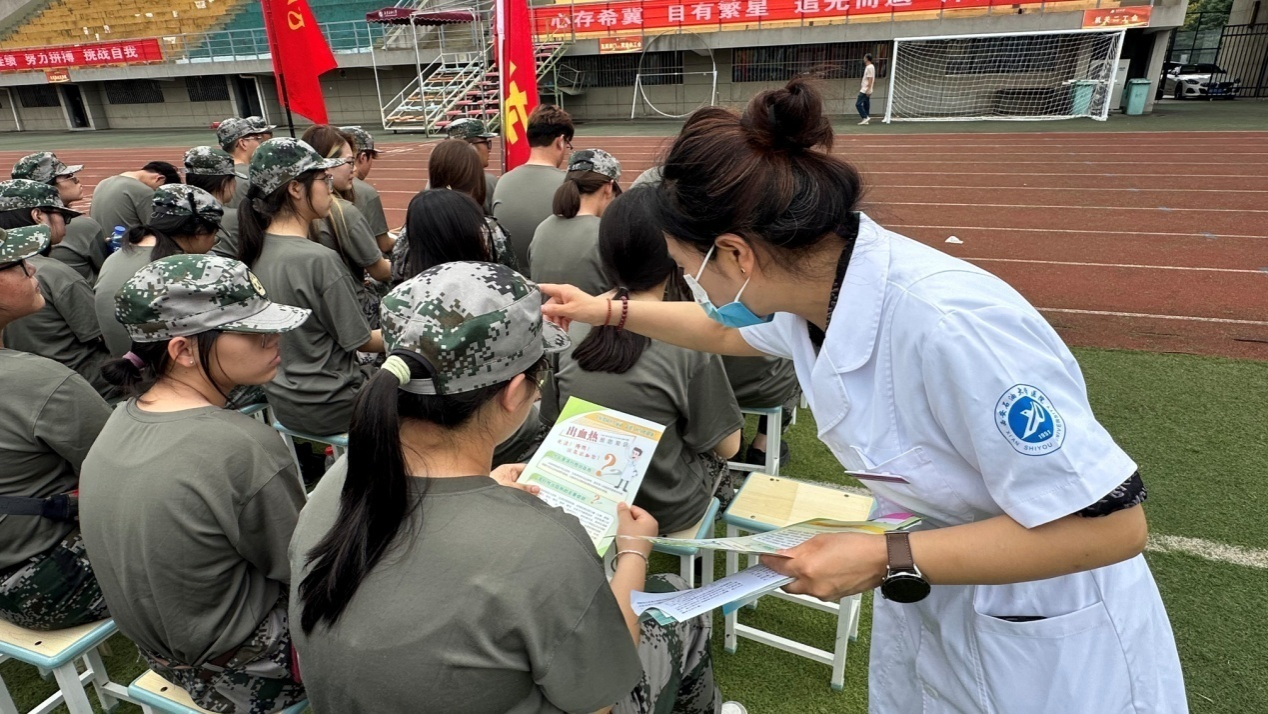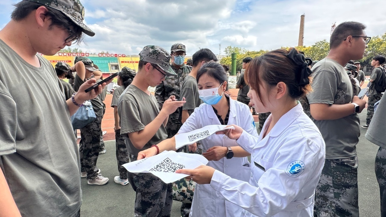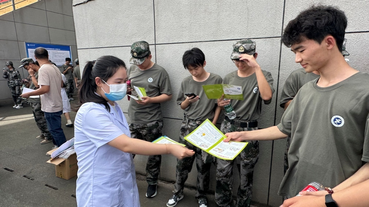 多維度服務,深化宣教實效:洪艷萍帶領醫務人員現場發放包含肺結核、腎綜合征出血熱、基孔肯雅熱防控內容的傳染病防治宣傳手冊,通過“集中講座+一對一答疑”的方式,精準化解新生健康知識盲區;同時結合上午急救演練內容,指導新生在傳染病(含肺結核、腎綜合征出血熱、基孔肯雅熱等傳染病)突發時的應急處置要點,強化“預防為先、科學應對”的健康理念。現場還組織新生完成艾滋病知曉率調查問卷,全面掌握新生健康知識儲備情況,為后續開展精準化健康宣教提供數據支撐。