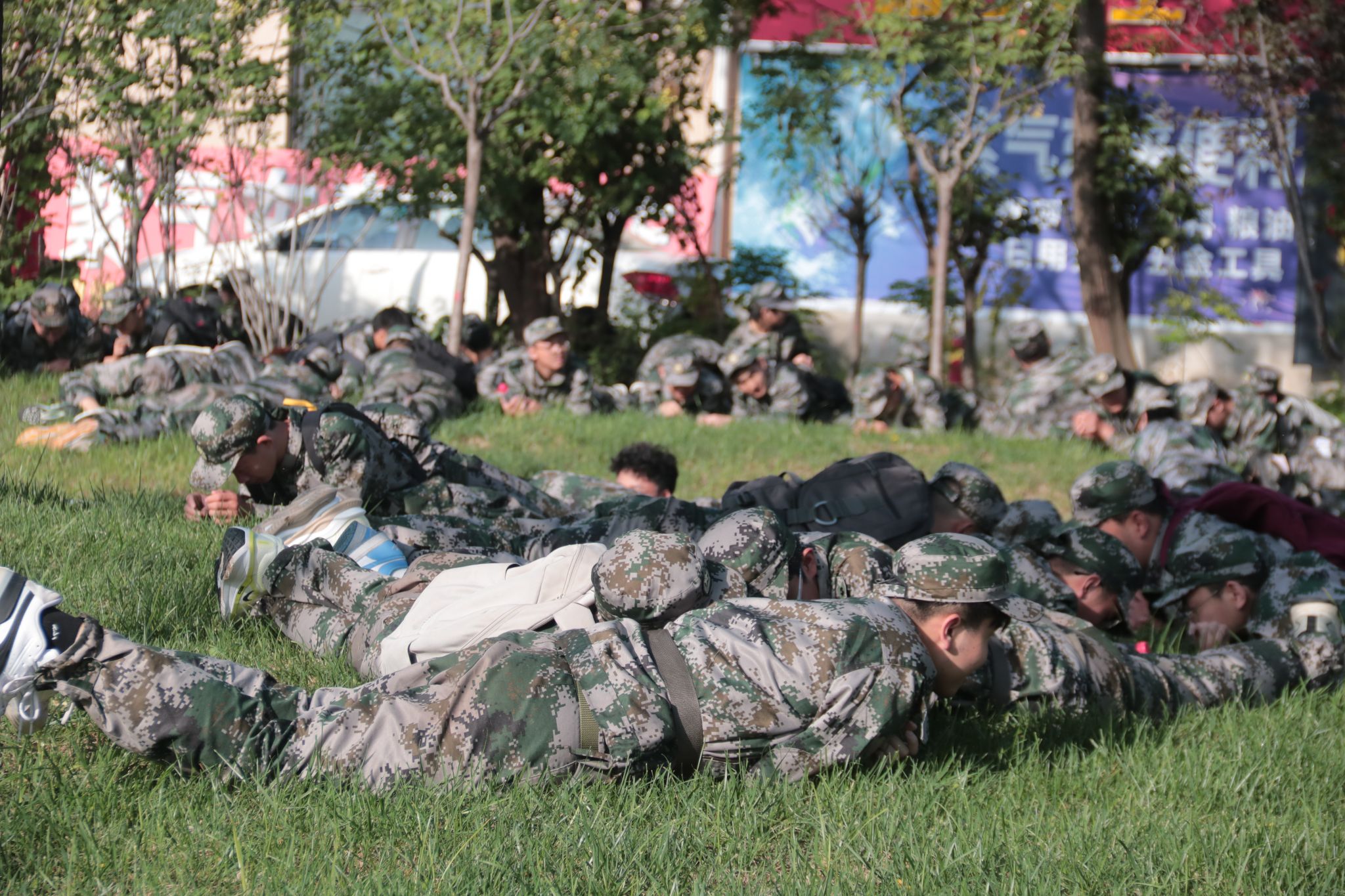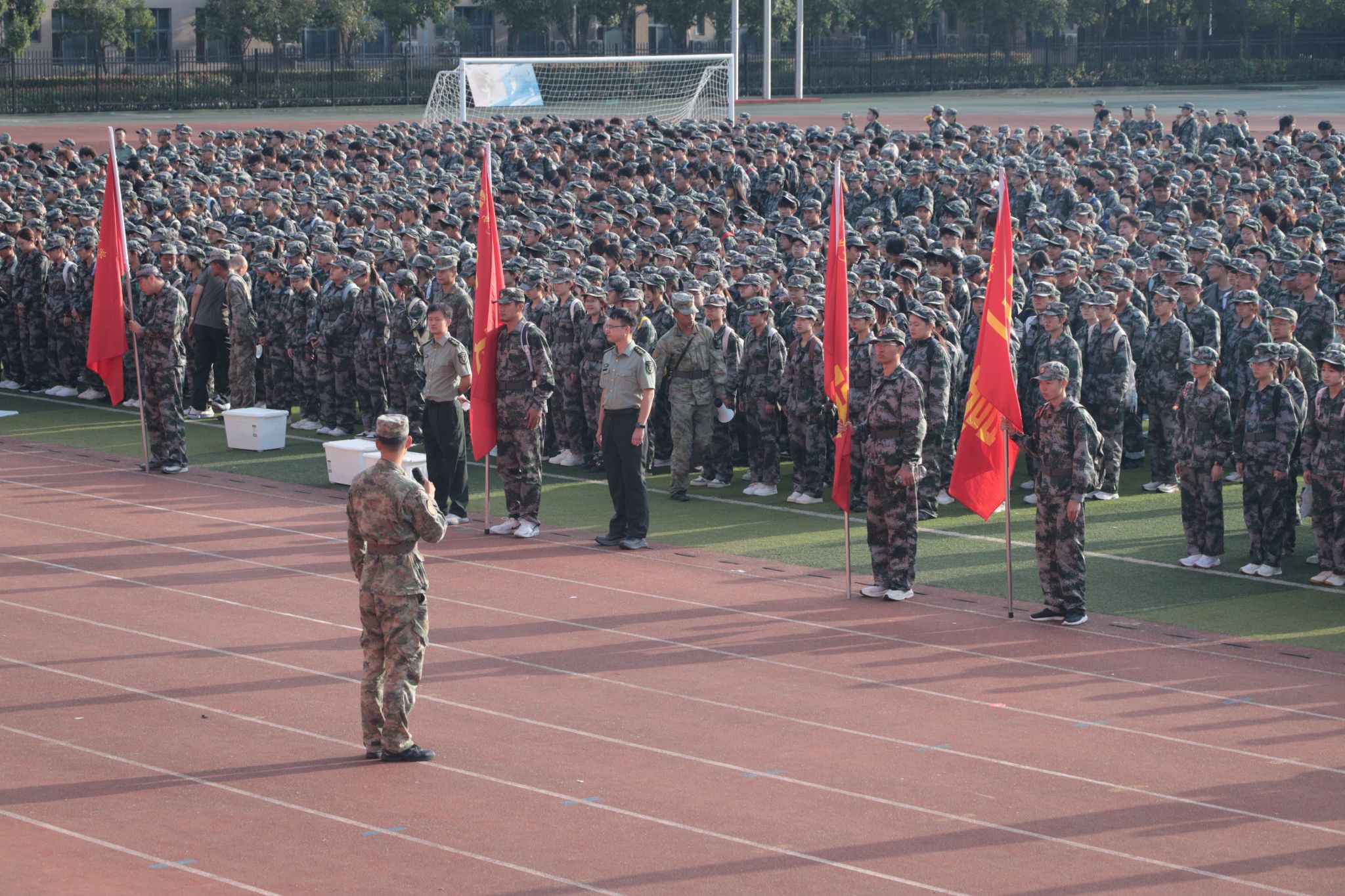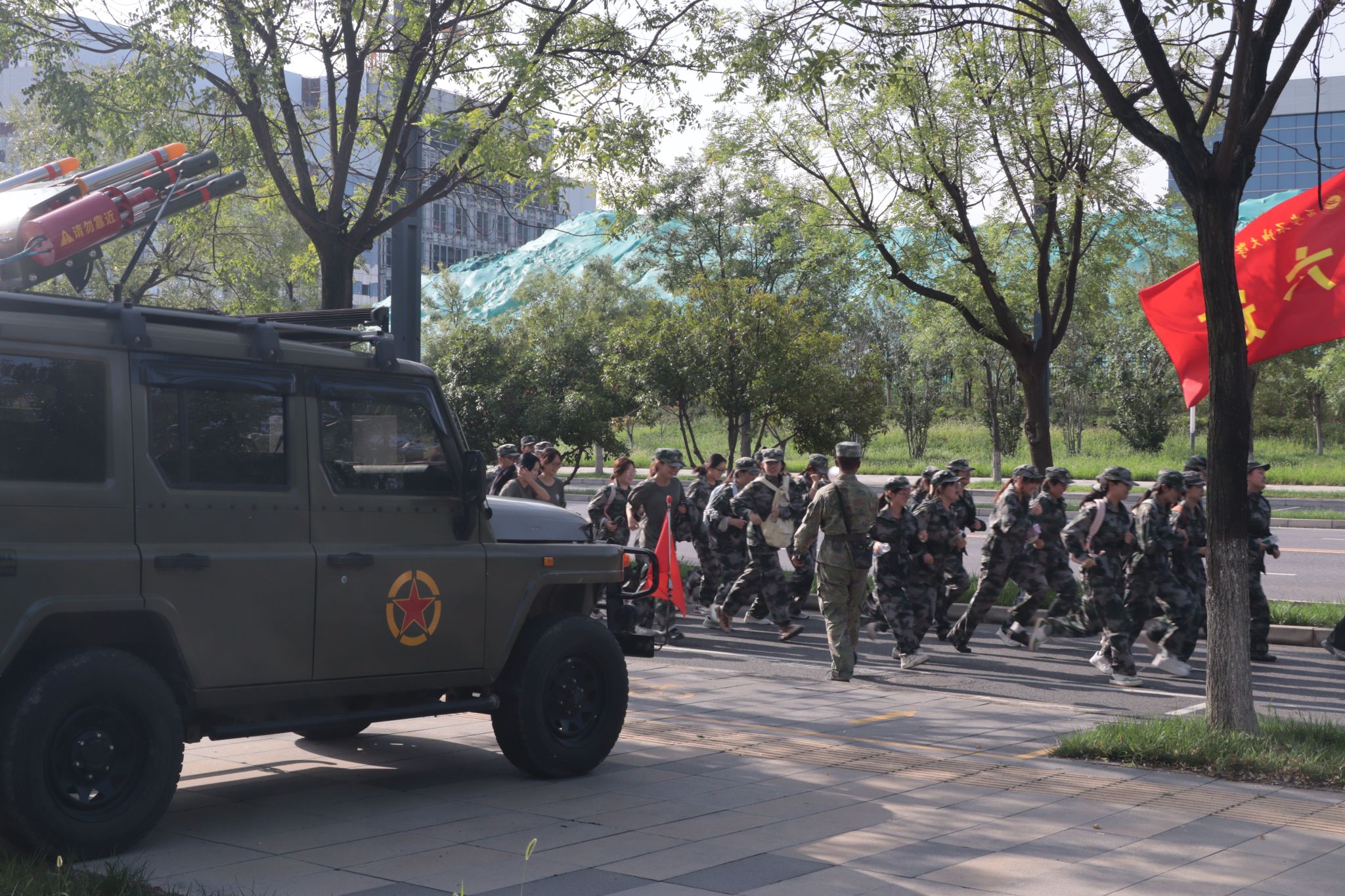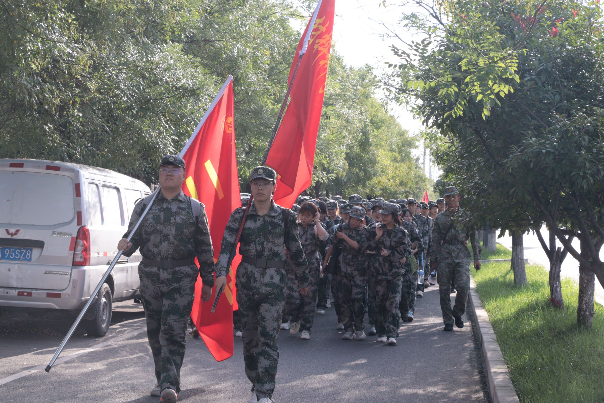 7:50,全體新生在東區操場集結完畢,按一營、二營、三營、四營的順序,以連為單位成四路縱隊依次出發,拉練路線以東區操場為起點,經學校東門出、北門進,沿途設置4個調整點。各連隊間隔保持20-30米,行軍速度控制在3公里/小時。上午11:30,全體新生順利返回東區操場。
