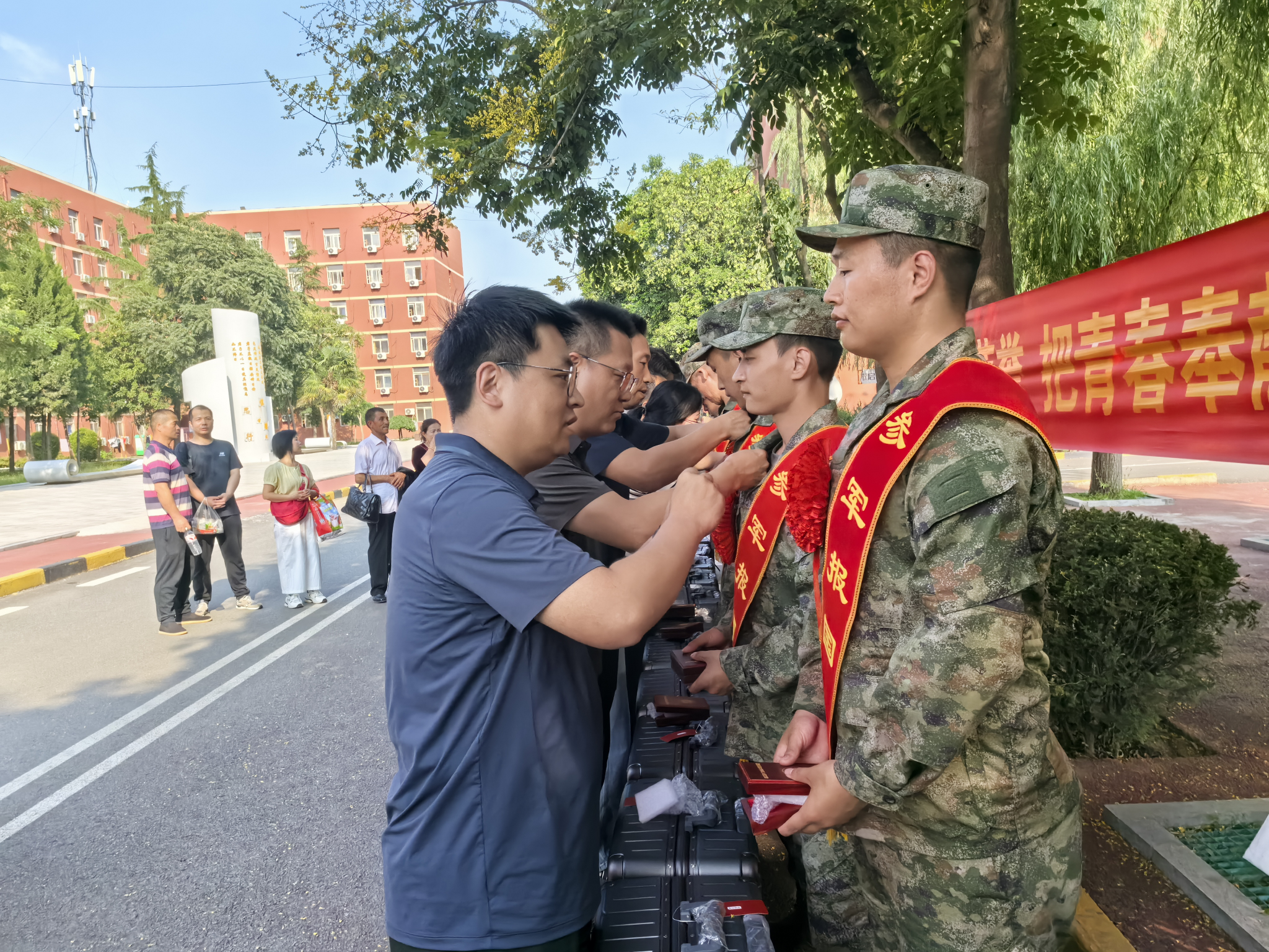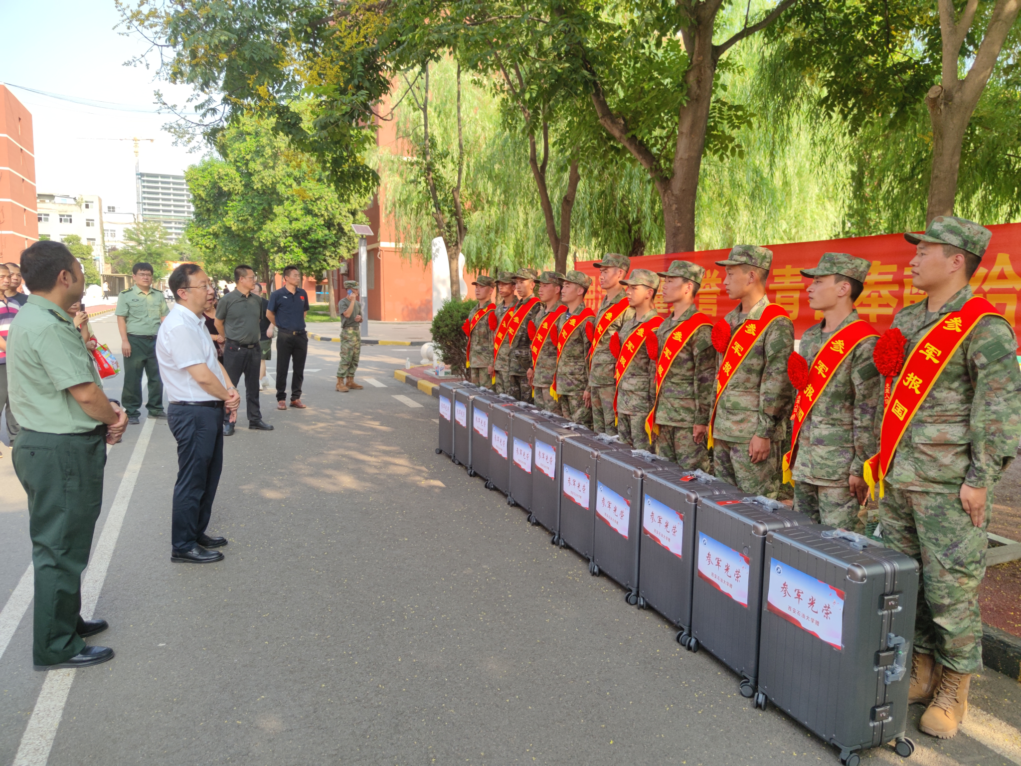在溫馨的氛圍中,老師們為入伍學生逐一佩戴西安石油大學參軍入伍紀念章,并送上精心準備的行李箱。同學們紛紛表示,到了部隊后,一定不會辜負學校的培養,會以最飽滿的熱情投入訓練,以最堅定的信念保家衛國,在軍營里刻苦磨礪、奮勇爭先,用實際行動為母校爭光,為國防事業貢獻自己的青春力量。