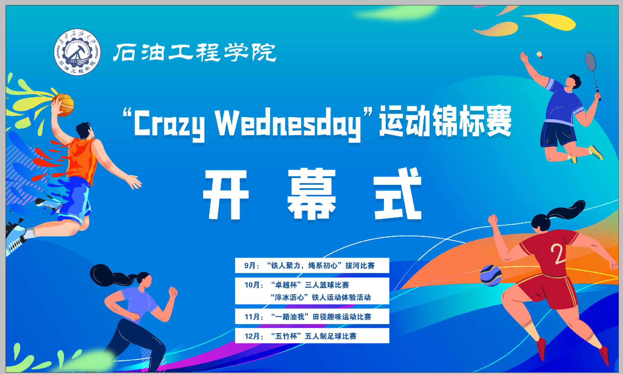 秋色浩無際,風露洗晴空。9月24日,石油工程學院在鄠邑校區田徑場舉辦“CRAZY WEDNESDAY”(瘋狂星期三)運動錦標賽開幕式。副校長趙健,黨委辦公室(校長辦公室)、黨委學生工作部、石油工程學院、體育學院負責同志,受聘教練員、師生代表300余人參加開幕式。