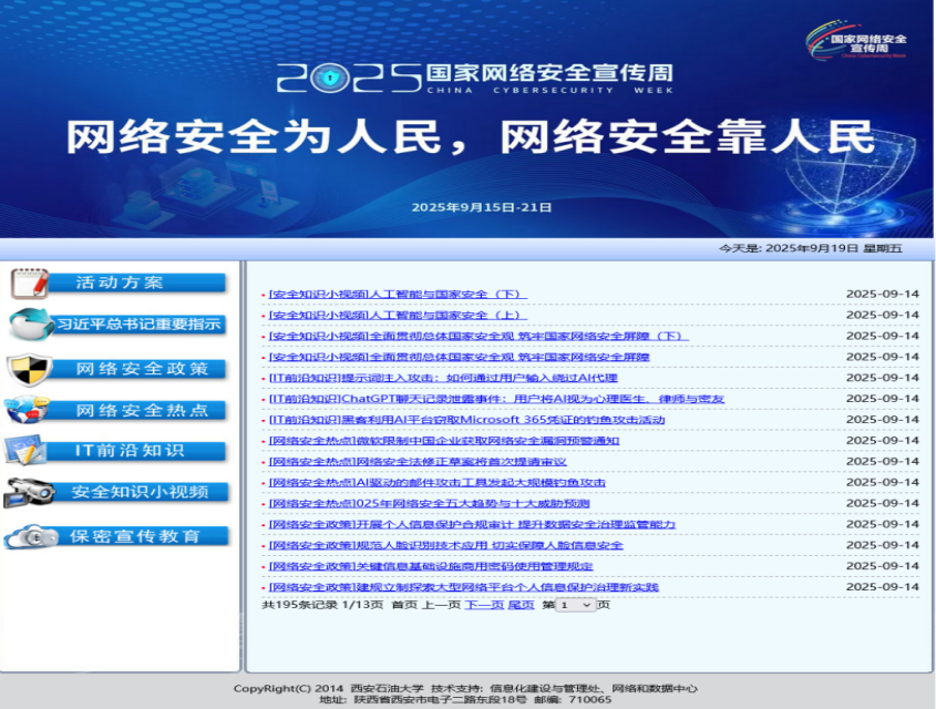 2025年9月15日至21日,西安石油大學圍繞“網絡安全為人民,網絡安全靠人民——以高水平安全守護高質量發展”主題,組織開展第十二屆國家網絡安全宣傳周系列活動。此次活動嚴格落實陜西省教育廳《2025 年陜西省教育系統第十二屆國家網絡安全宣傳周活動實施方案》要求,深入宣傳貫徹習近平總書記關于網絡強國的重要思想及“四個堅持”重要指示精神,普及網絡安全領域法律法規,全面提升廣大師生網絡安全意識與防護能力。我校信息化建設與管理處會同宣傳部、學生工作部、保衛部等部門組織開展了豐富多彩的網絡安全周宣傳活動,具體活動如下: