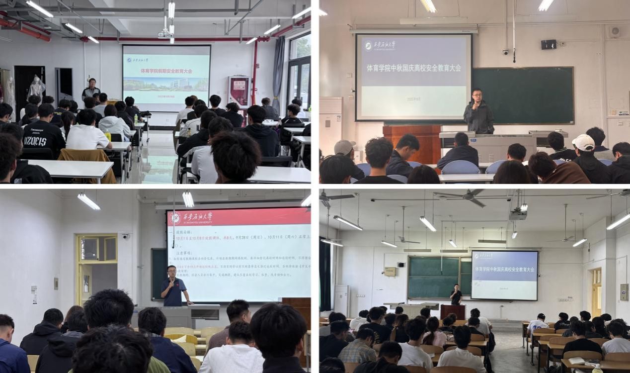 為切實做好中秋國慶假期學生安全教育工作,引導學生合理安排假期生活,提高新生自我管理能力,維護校園安全穩定,9月23日至28日,按照學院黨總支假期安全工作安排,體育學院各年級召開了中秋國慶假期安全教育大會。大會由學院學工辦主任姜國平、輔導員老師張澤正主講,學院各年級學生參會。