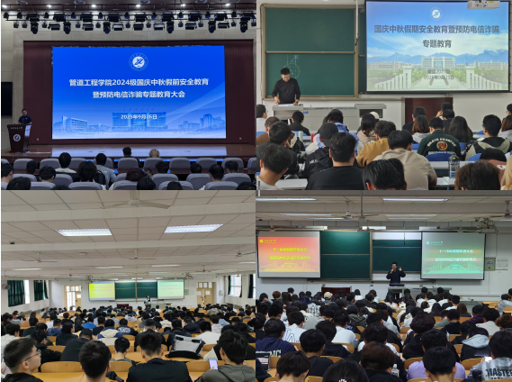為切實增強學生的安全防范意識,有效預防電信詐騙案件的發生,確保學生度過一個安全、祥和的假期,在國慶、中秋雙節來臨之際,9月24日-9月28日,管道工程學院各年級均開展了國慶中秋節前安全教育暨預防電信詐騙專題教育大會。